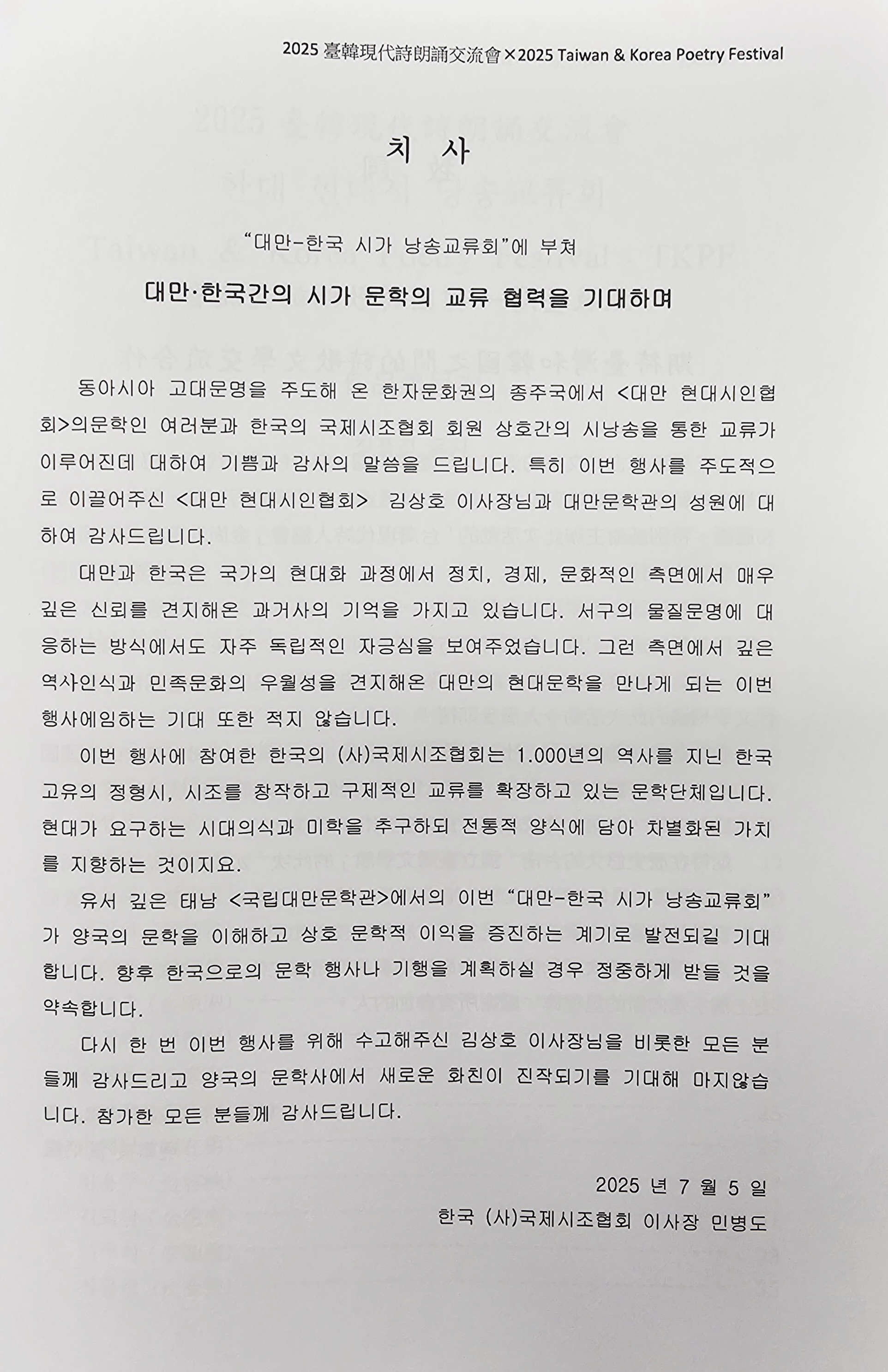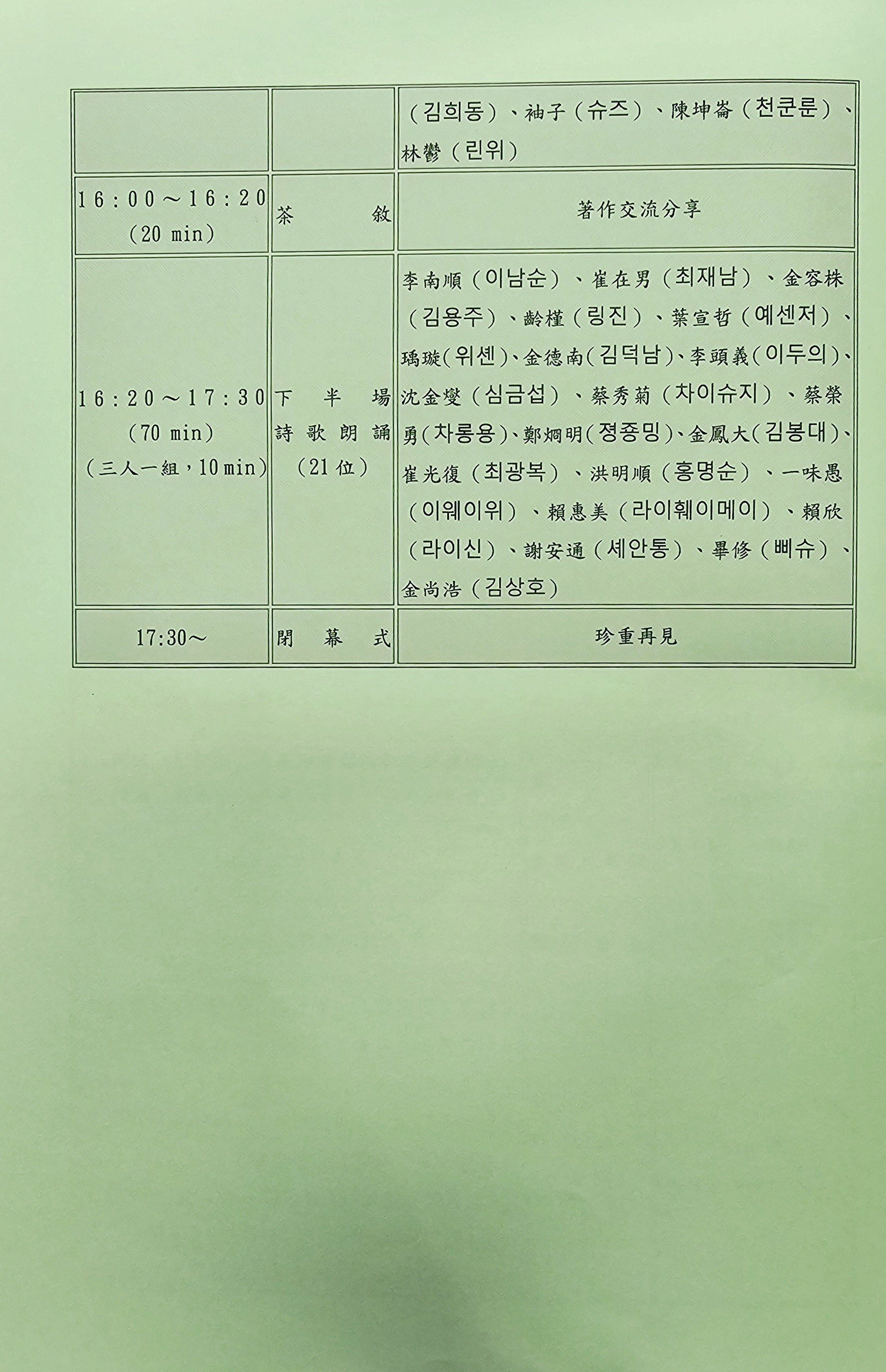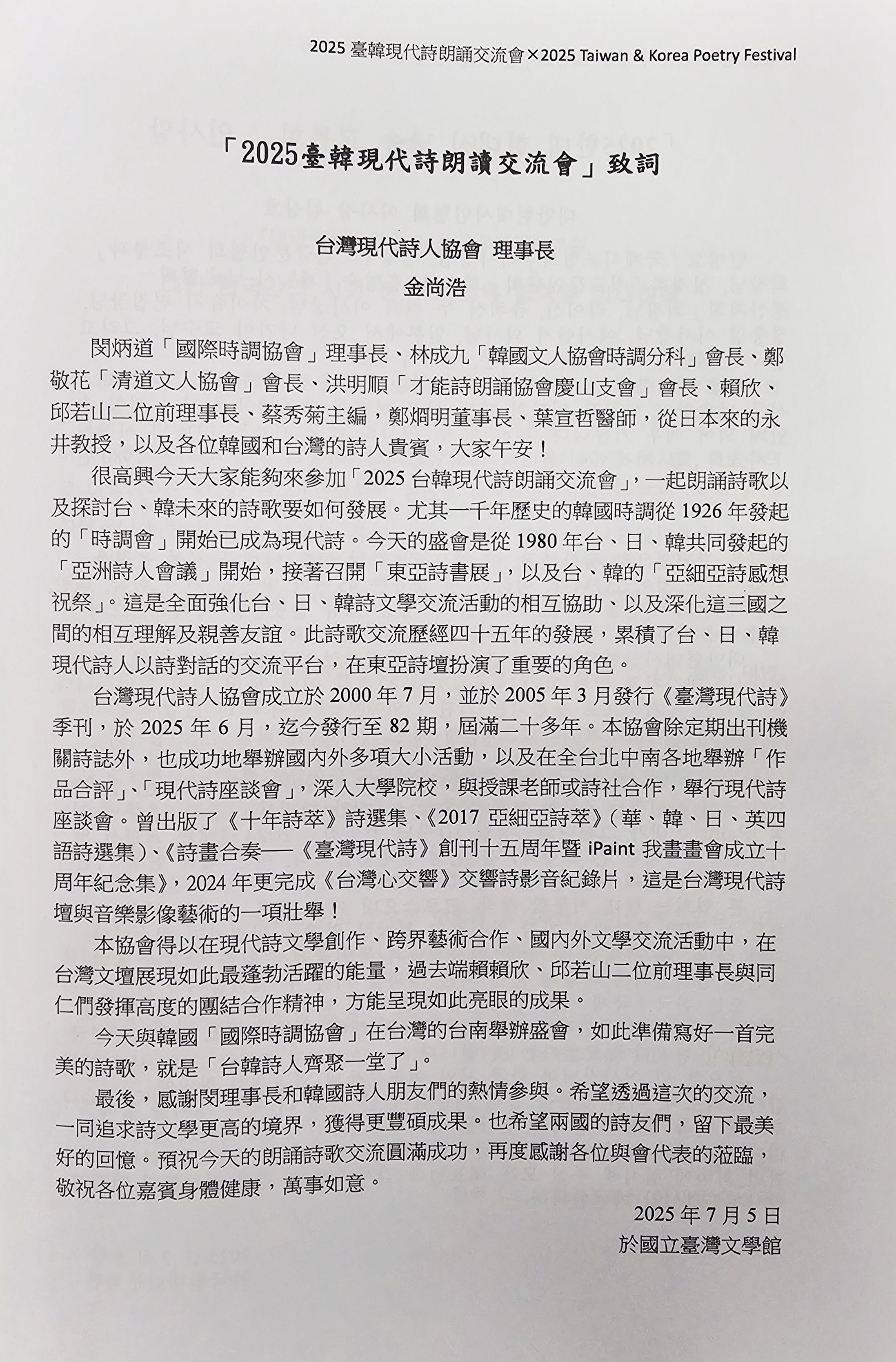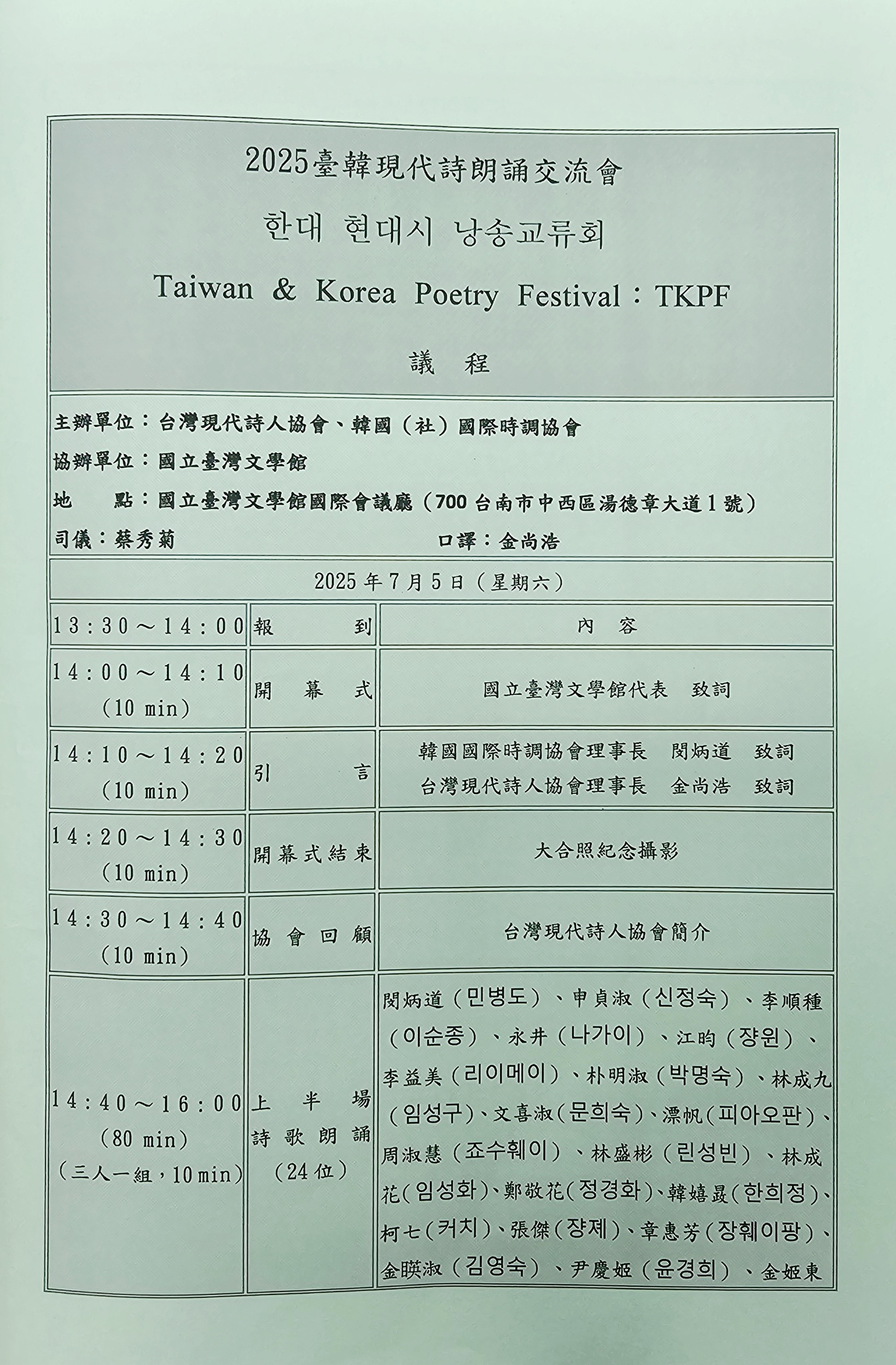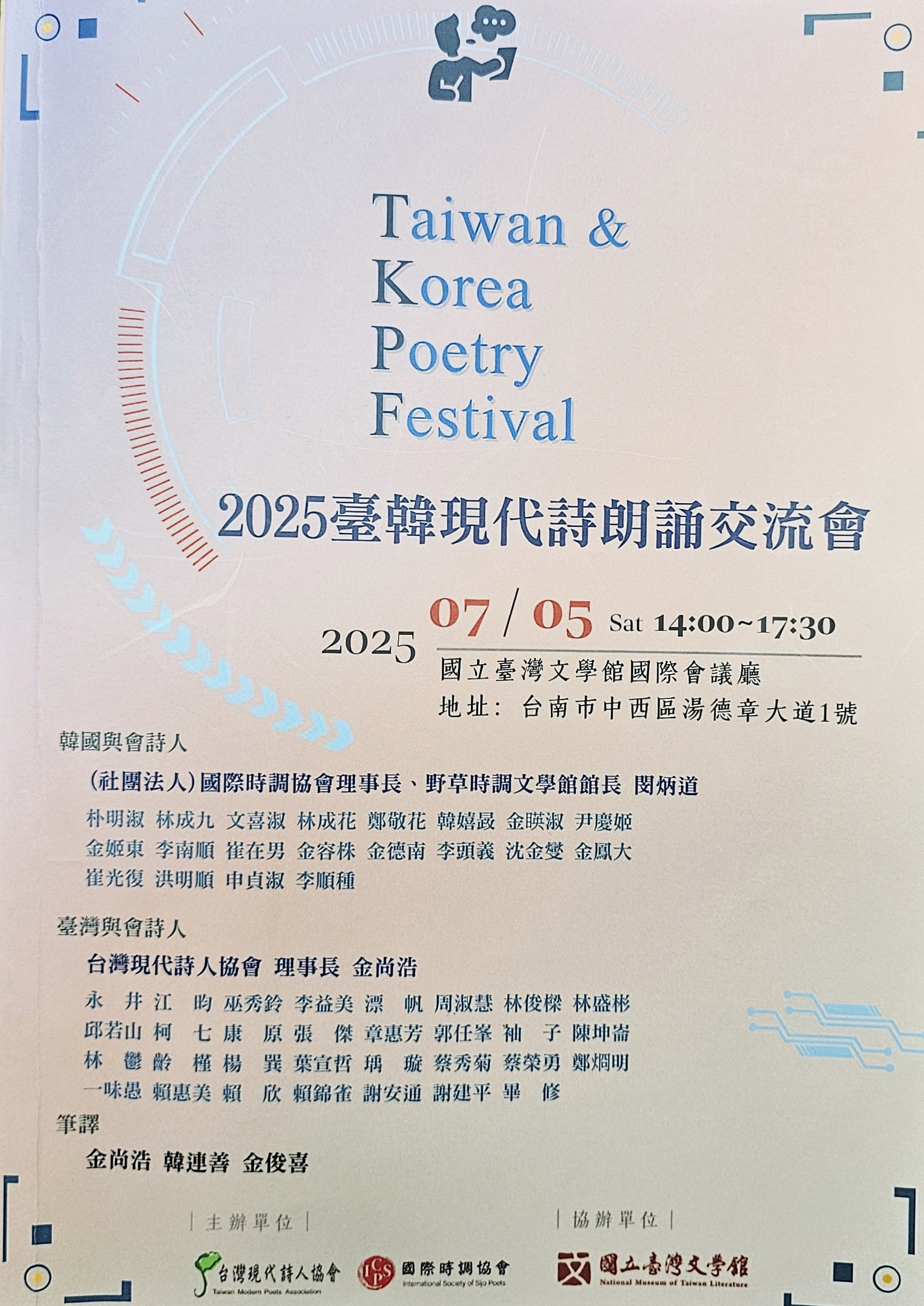 2025 한국·대만 시낭송 교류회 2 - 국립대만문학관 (2025. 7. 5.) 작성자최광복|작성시간25.07.13|조회수25 목록 댓글 0 글자크기 작게가 글자크기 크게가 2025 한국·대만 시낭송 교류회 2 - 국립대만문학관 (2025. 7. 5.) 다음검색 현재 게시글 추가 기능 열기 북마크 공유하기 신고 센터로 신고 댓글 댓글 0 댓글쓰기 댓글 리스트