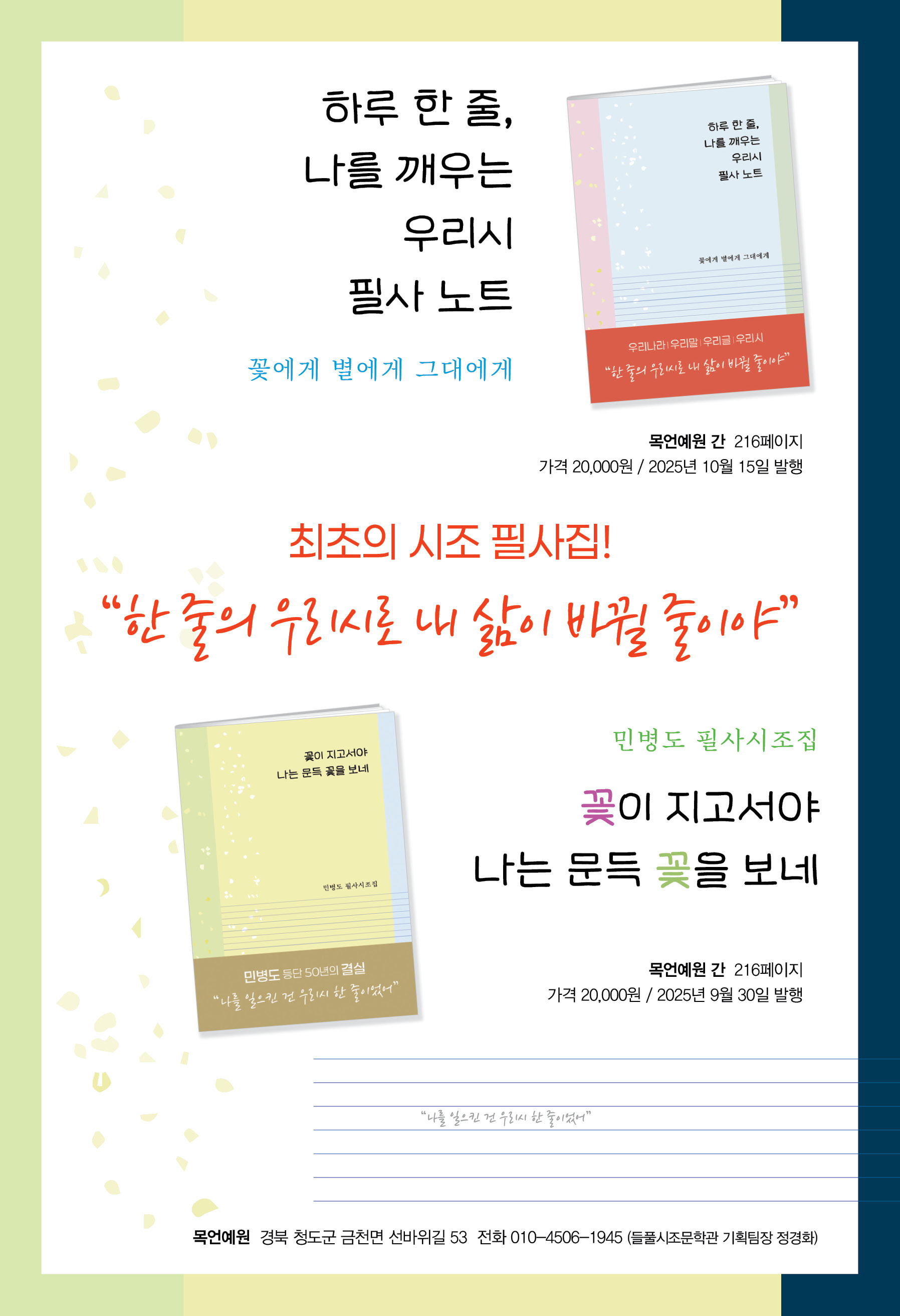 하루 한 줄, 나를 깨우는 우리시 필사노트 / 꽃이 지고서야 나는 문득 꽃을 보네 작성자최광복|작성시간25.11.06|조회수4 목록 댓글 0 글자크기 작게가 글자크기 크게가 하루 한 줄, 나를 깨우는 우리시 필사노트 『꽃에게 별에게 그대에게』민병도 필사시조집 『꽃이 지고서야 나는 문득 꽃을 보네』 다음검색 현재 게시글 추가 기능 열기 북마크 공유하기 신고 센터로 신고 댓글 댓글 0 댓글쓰기 답글쓰기 댓글 리스트
