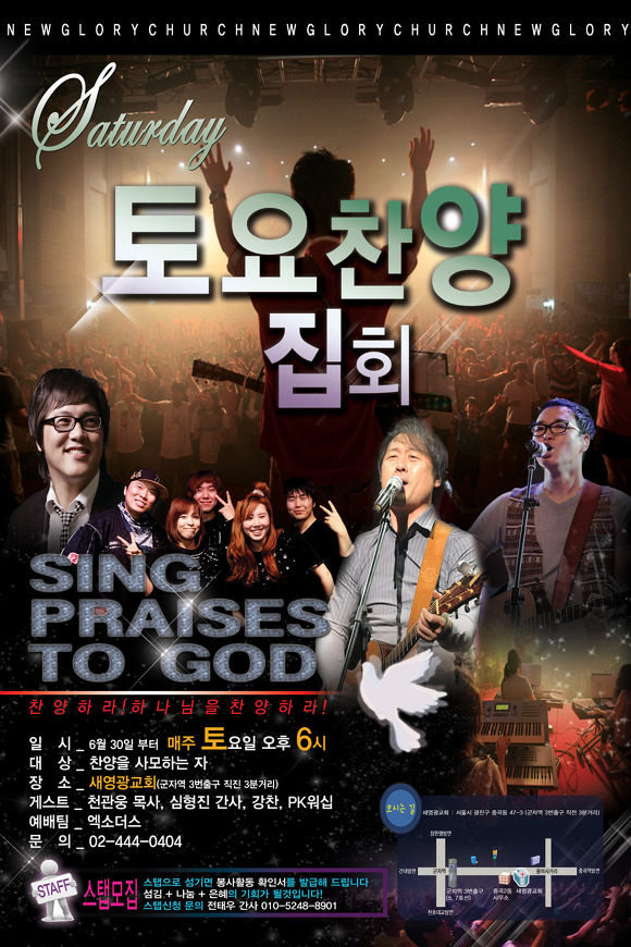현재 매주 토요일 집회가 있으며 천관웅, pk, 강찬, 심형진등 메이저급의 찬양사역자들도 게스트로 함께 하고 있습니다.