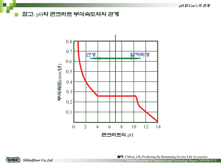 속도에 주는 악영향은 빠르게 증가하게 됩니다. 물론 위의 그래프 상 ph 4~10 구간의 콘크리트 부식속도는 일정하지만 ph가