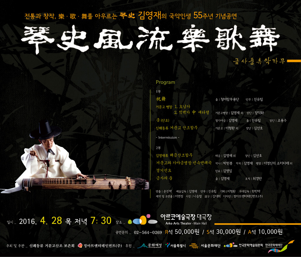 전통과 창작 악가무(樂歌無)에 두루 능통한 김영재 명인의 국악인생 55주년을 회고하는 풍류객 무대. 국악의 길을 함께 걸어 온 장덕화명인, 최경만명인, 진유림명무, 김영임명창이 함께하는 무대. 미추극단 손진책 대표의 연출과 동양 철학박사 박재희 교수의 대화로 진행하는 새로운 무대가 펼쳐집니다. <김영재 국악인생 55주년 기념공연 “琴史風流樂歌舞”>많은 관심 부탁드립니다.
