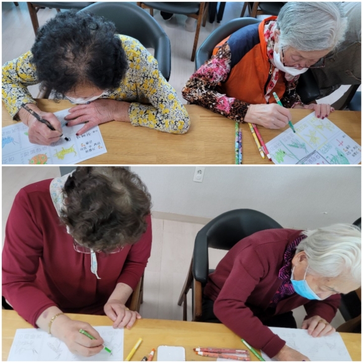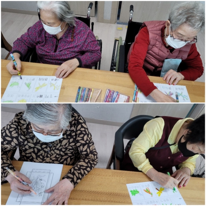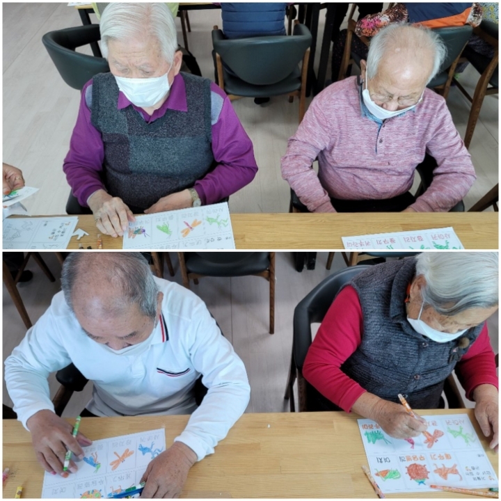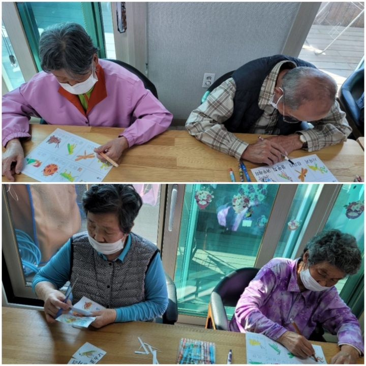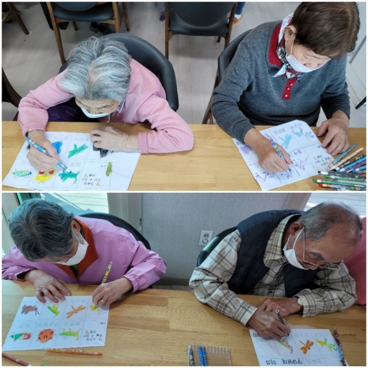 이면지나 곤충그림 위에 어르신께서 색칠하신 그림을