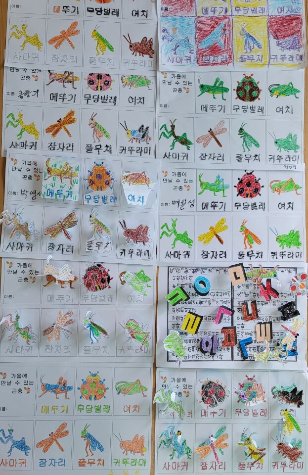 색을 칠한 활동지를 보며 곤충이름을 하나씩 읽어보았어요~