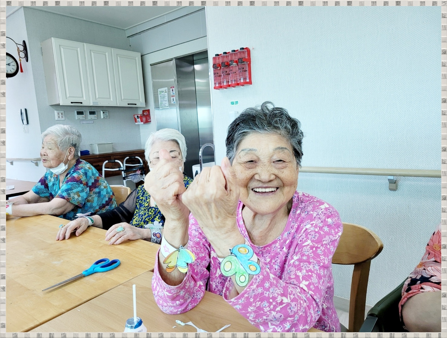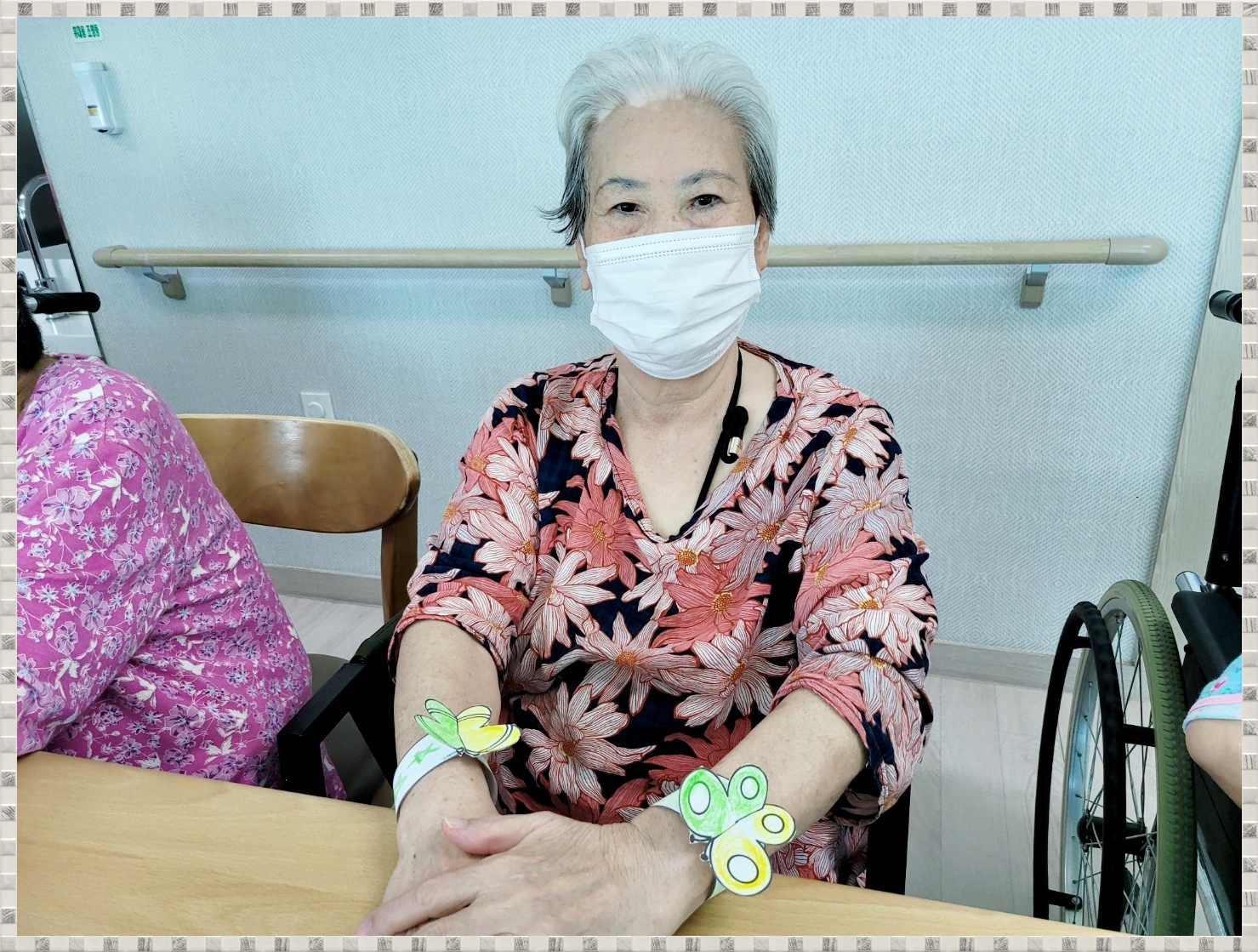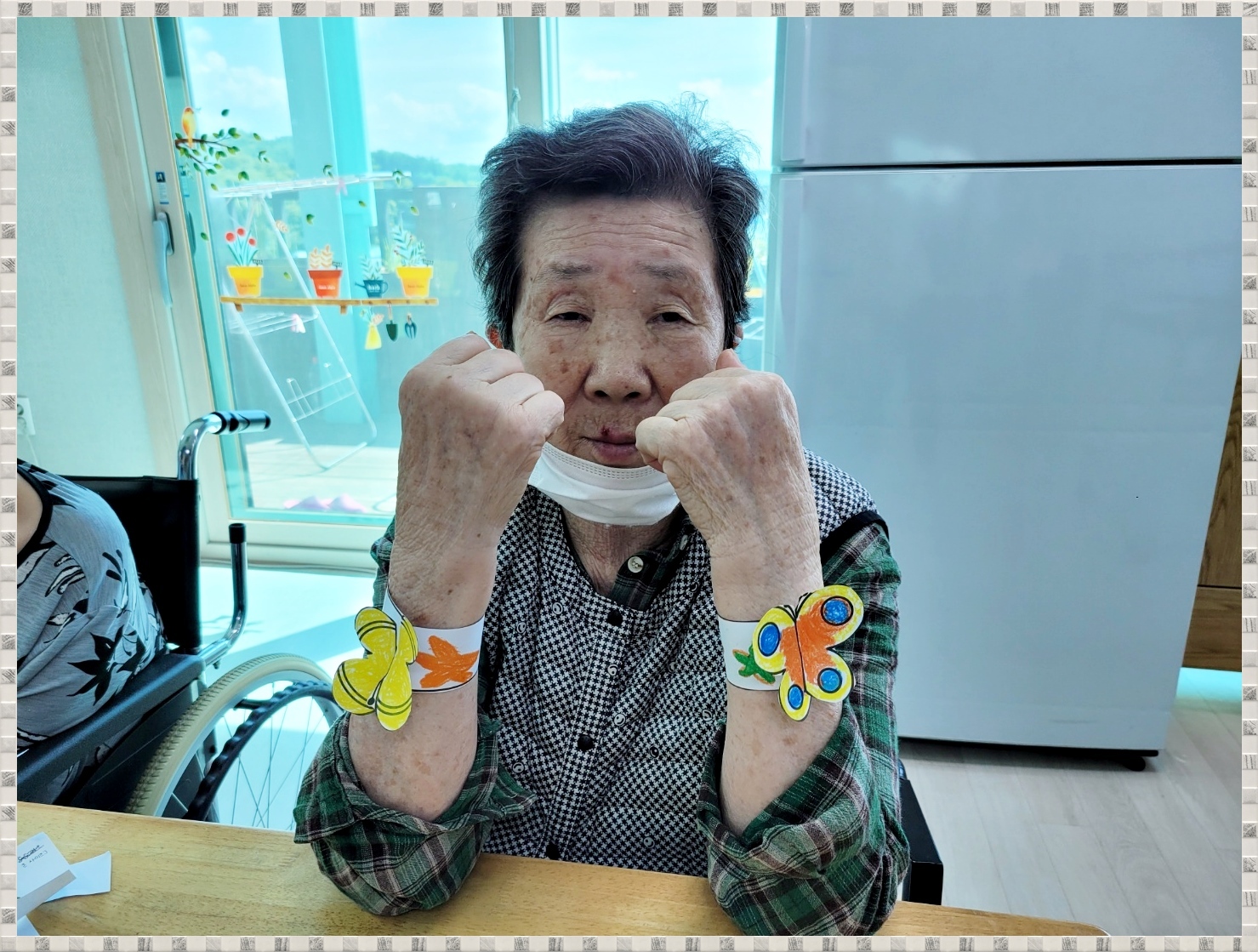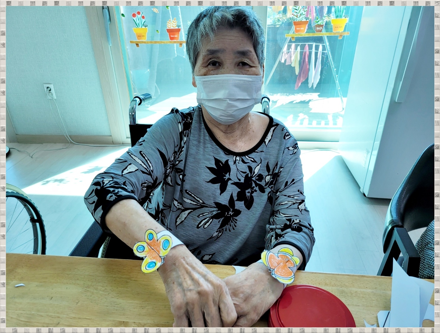 남*예 어르신께서는 " 예쁜 나비가 내 손목에 두마리가 앉았네~~" 라고 하시며 완성작품 팔찌를 보시며 만족해 하시는 모습을
