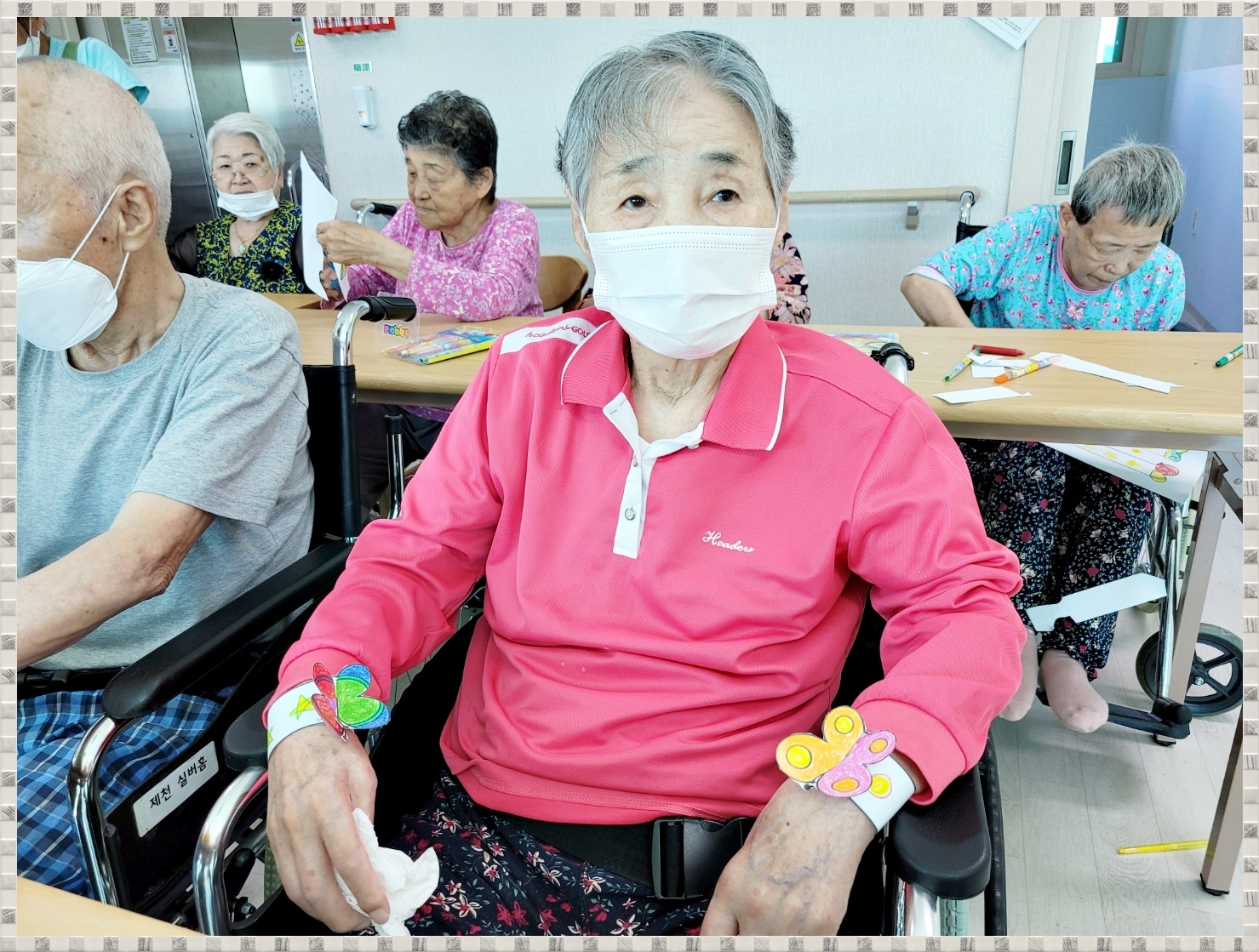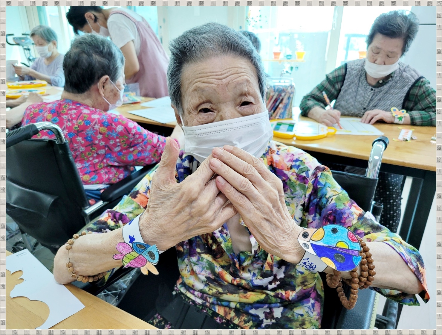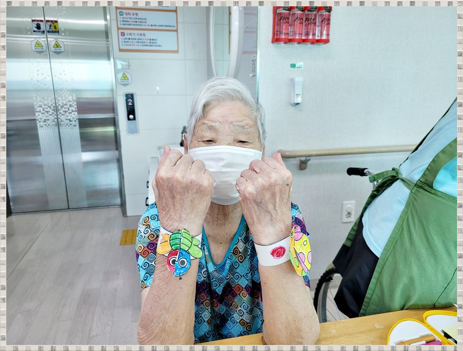 남*예 어르신께서는 " 예쁜 나비가 내 손목에 두마리가 앉았네~~" 라고 하시며 완성작품 팔찌를 보시며 만족해 하시는 모습을