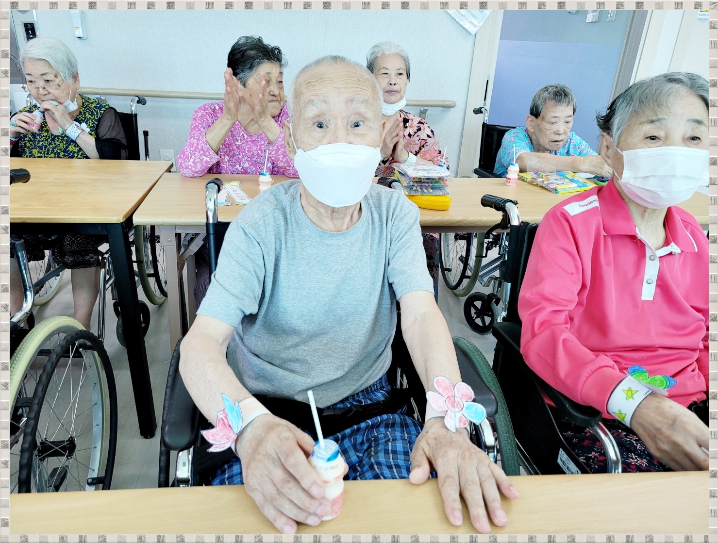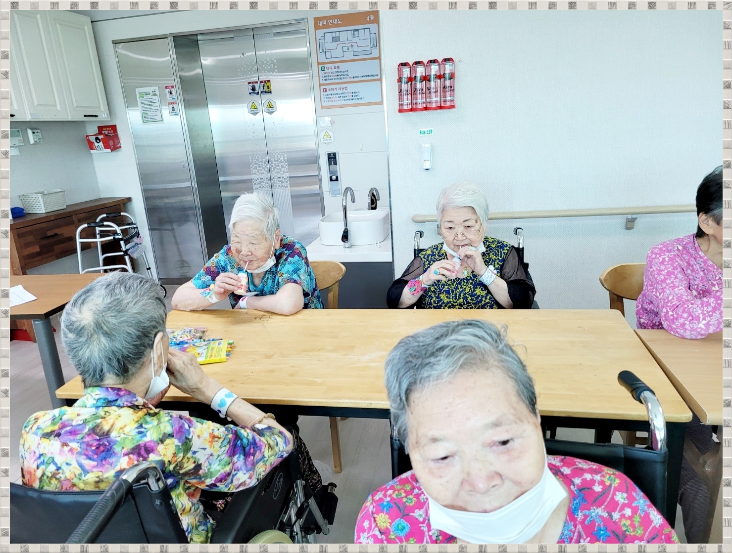 팔찌 만들기 프로그램이 끝난 후에는 어르신들에게 시원한 야구르트를 제공해드렸습니다 어르신들께서는 " 달달하니 맛있네"