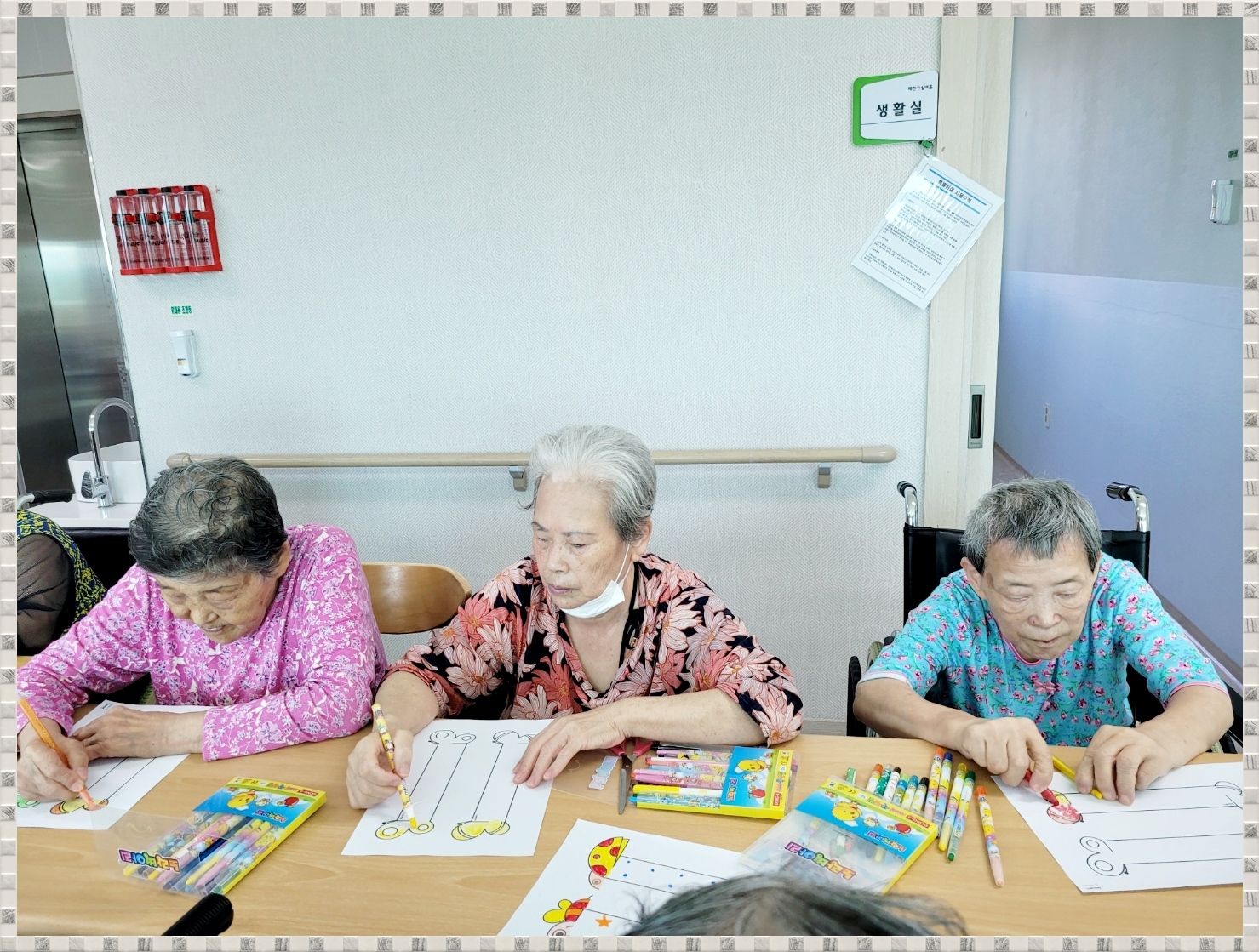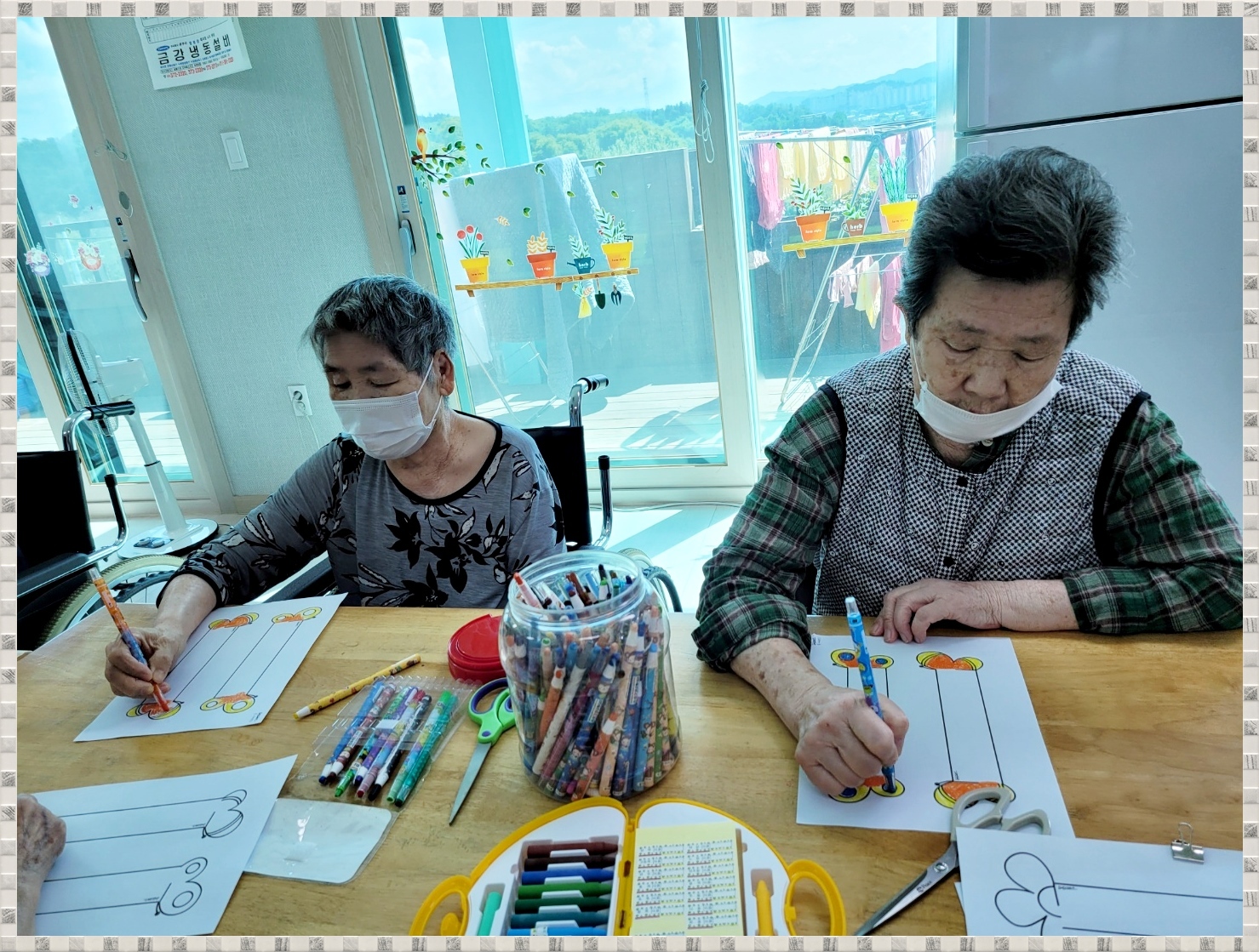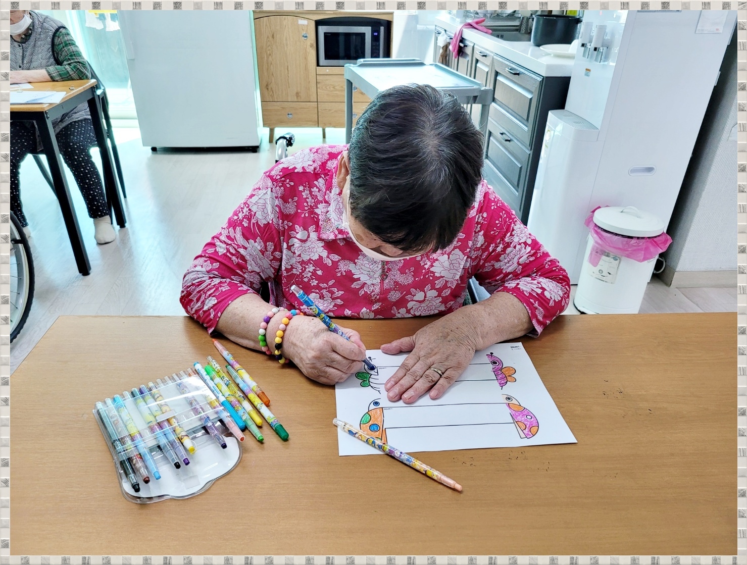 남*예 어르신께서는 " 역시 나비는 노란색나비가 화려한것 같아~~" 하시며 노란색과 주황색으로 색칠하시는 모습을 보이셨습