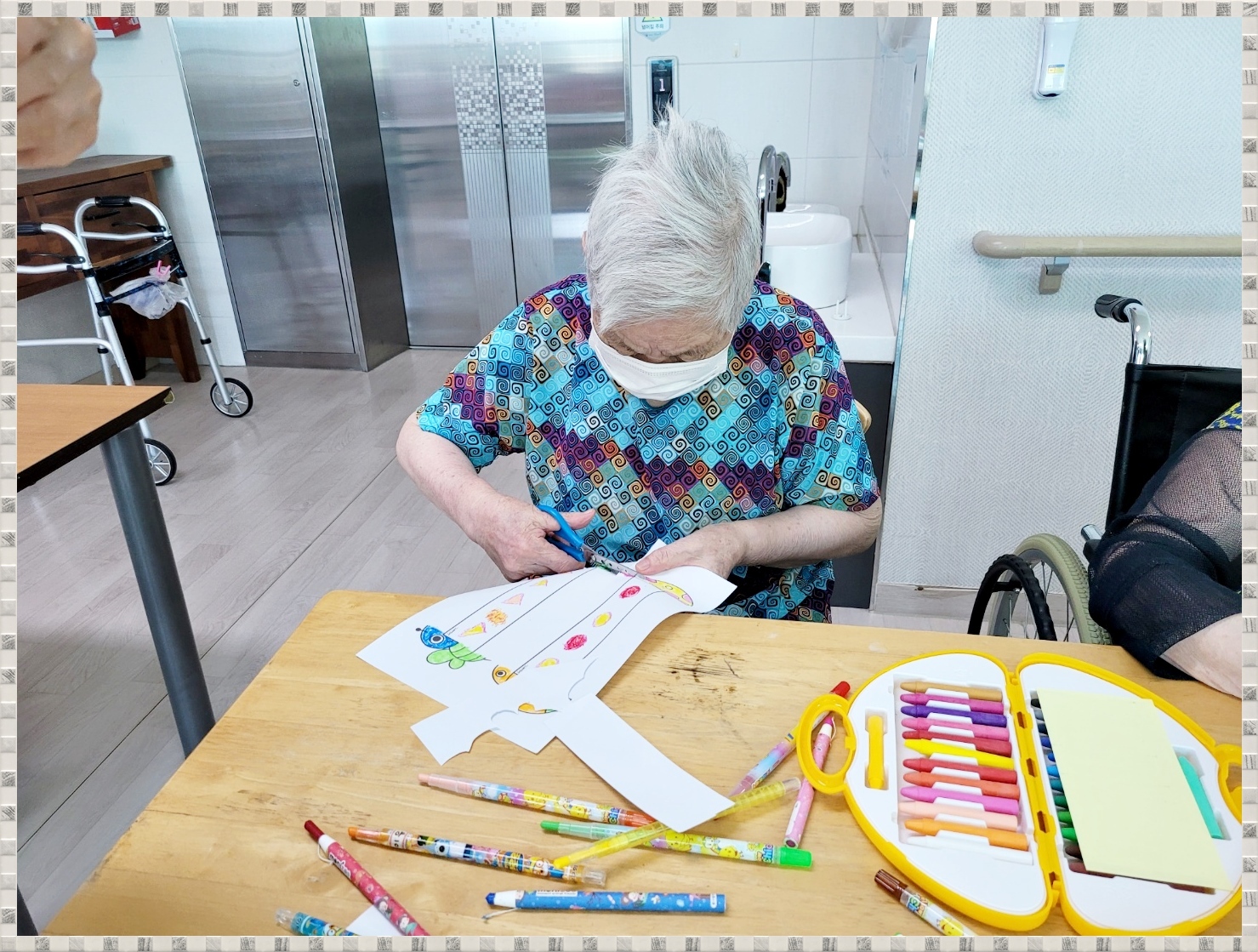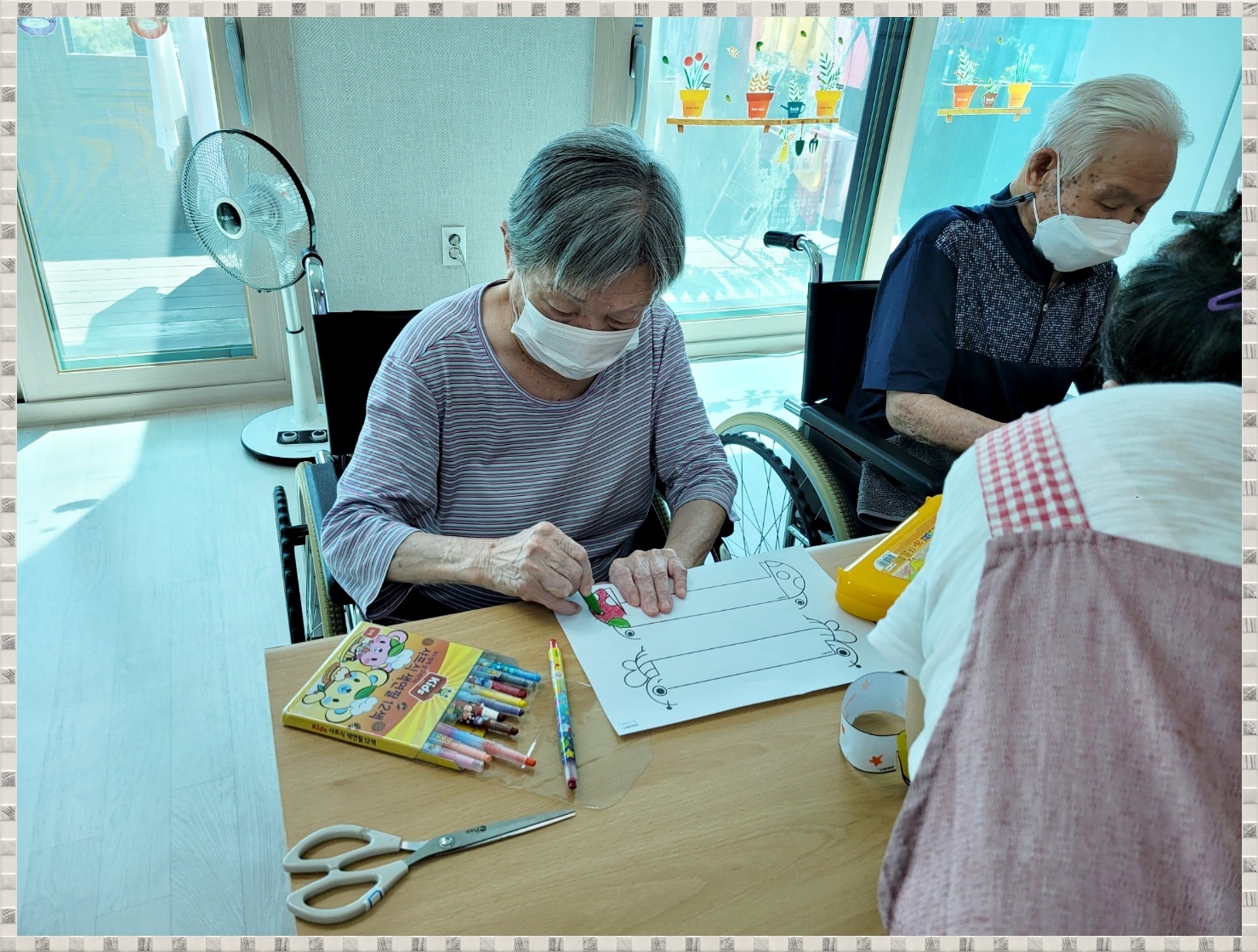 김*단 어르신께서는 " 반짝이 스티커를 하나 갖다 줘~~여기 가운데에 꾸며보게" 하시며 *단 어르신 의견을 반영하여 스티커를