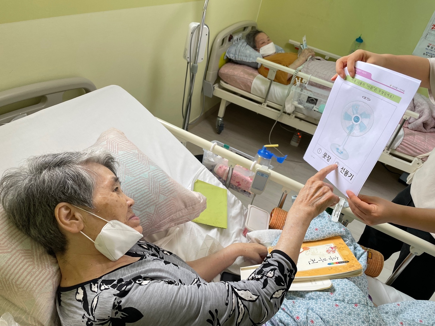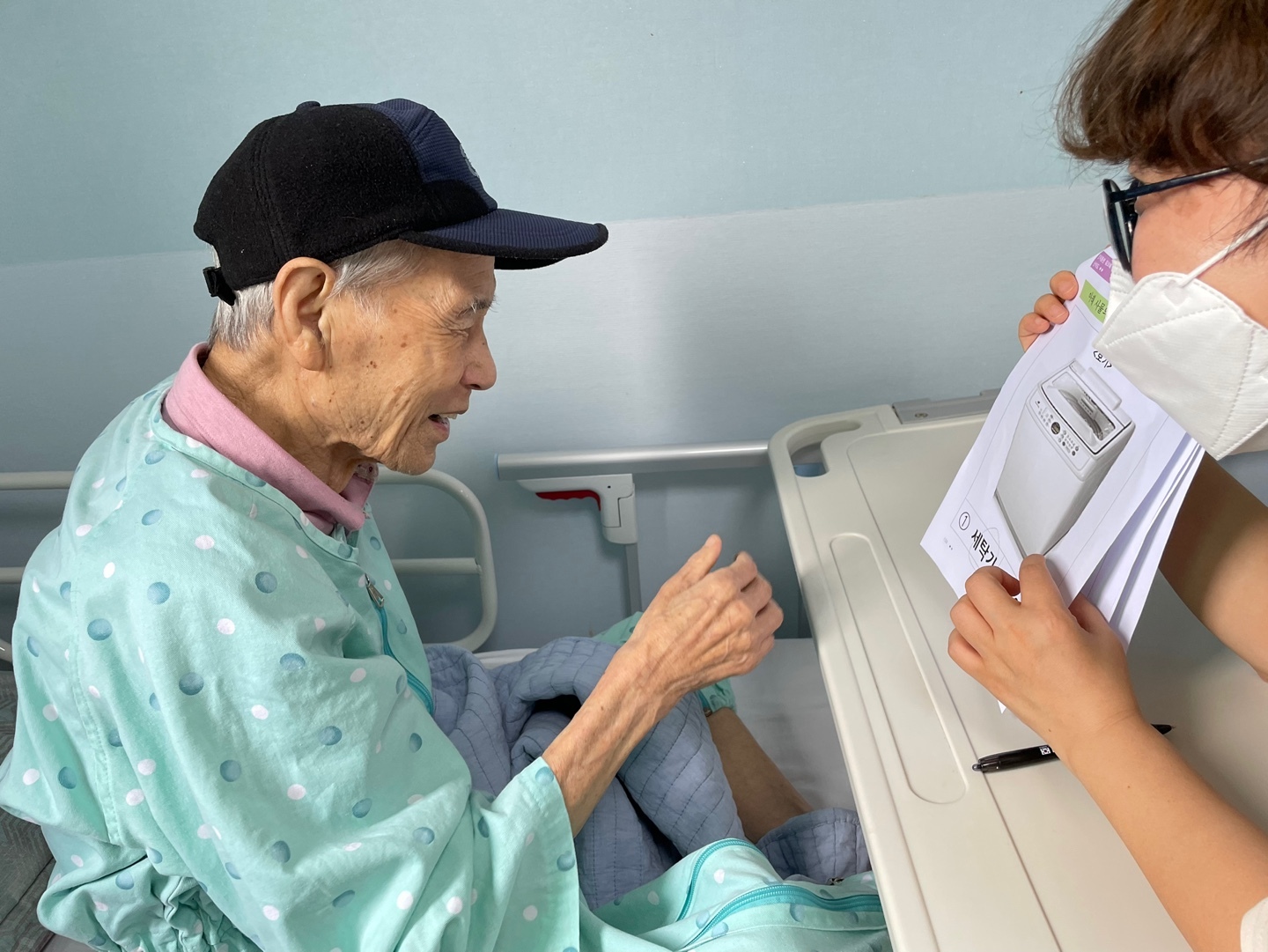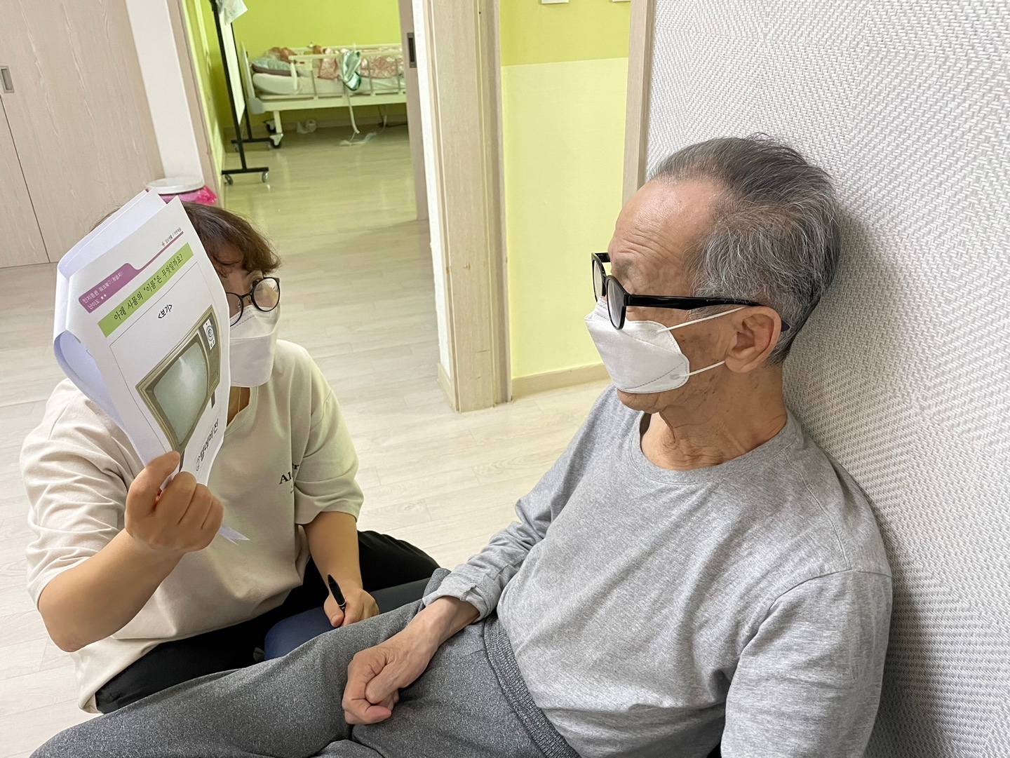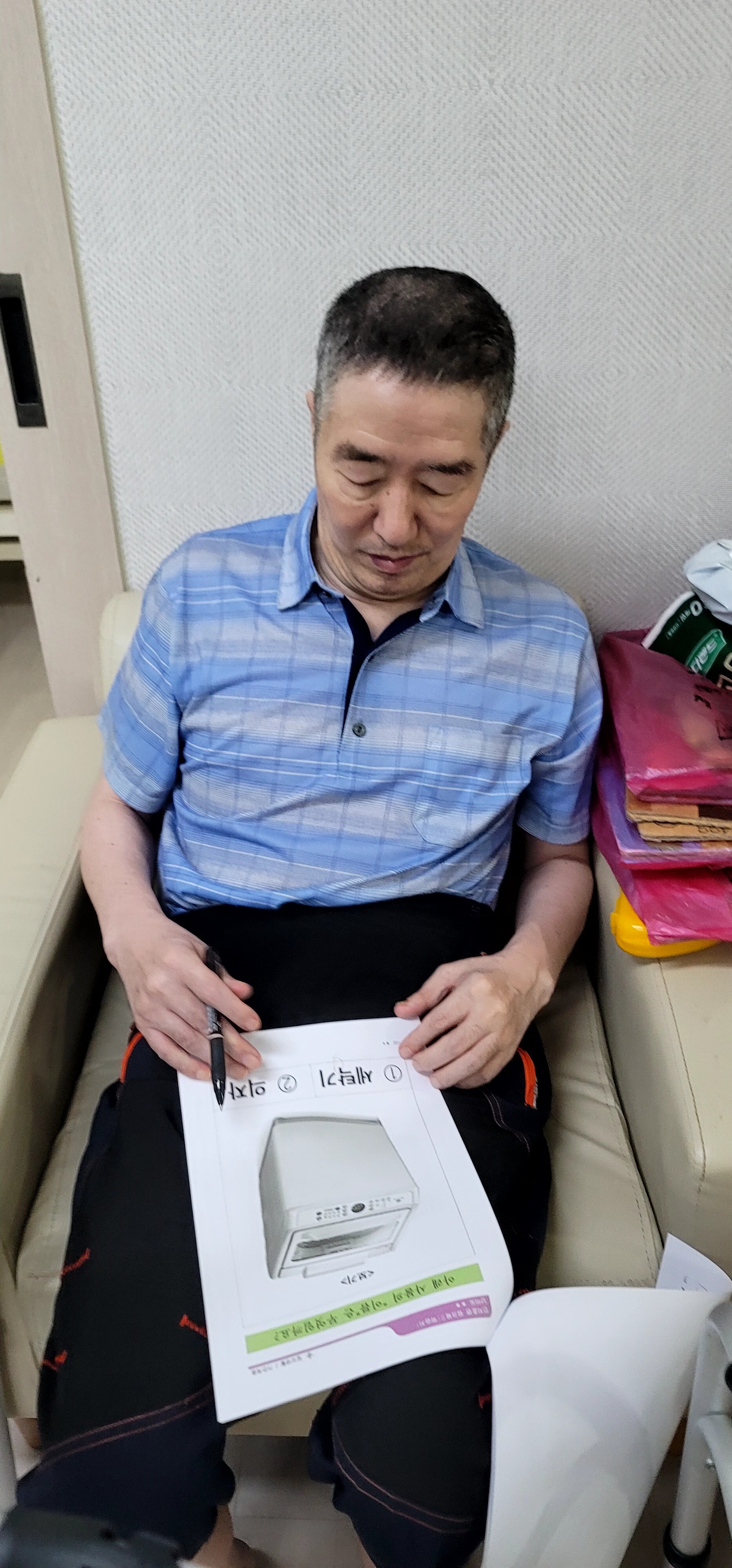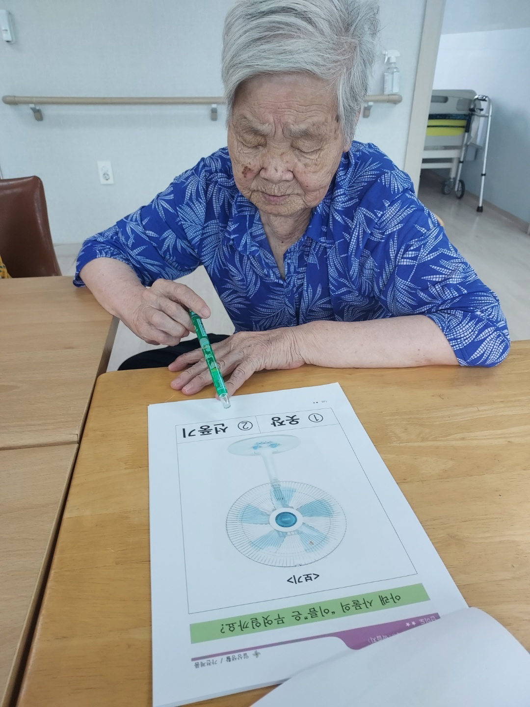 그림을 보며 그림과 같은 글자에 열심히 체크하시는 차*천 어르신