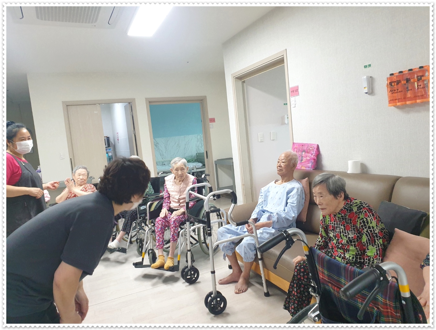 건강박수를 마치고 서로 인사드리며 영상시청을 준비하시는 모습입니다