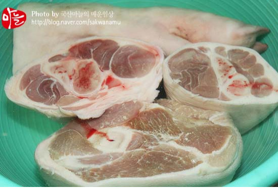 불순물묻은것없도록 깨끗이 헹군 돼지 앞다리는 냄비에 담아주시고
