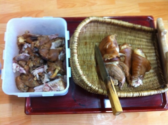 가스불을 끄고 다 삶아진 족발을 평평한 도마나 쟁반위에 건져