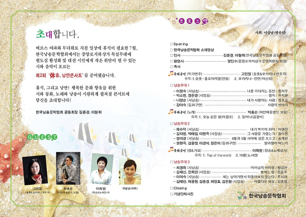 한국낭송문학협회가 주최하는 <제2회> 시와 음악이 흐르는 '休휴, 낭만콘서트' 에 여러분을 초대합니다^^