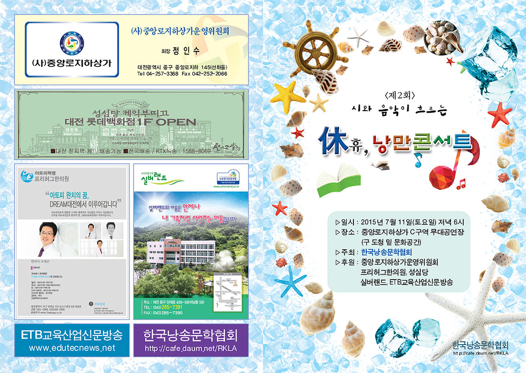 일시: 2015년 7월 11일(토) 저녁 6:00 장소: 중앙로지하상가 C구역 무대공연장 (구 도청 밑 문화공간) 주최: 한국낭송문학협회 후원: 중앙로지하상가운영위원회, 프리허그한의원, 성심당, 실버랜드, ETB교육산업신문방송
