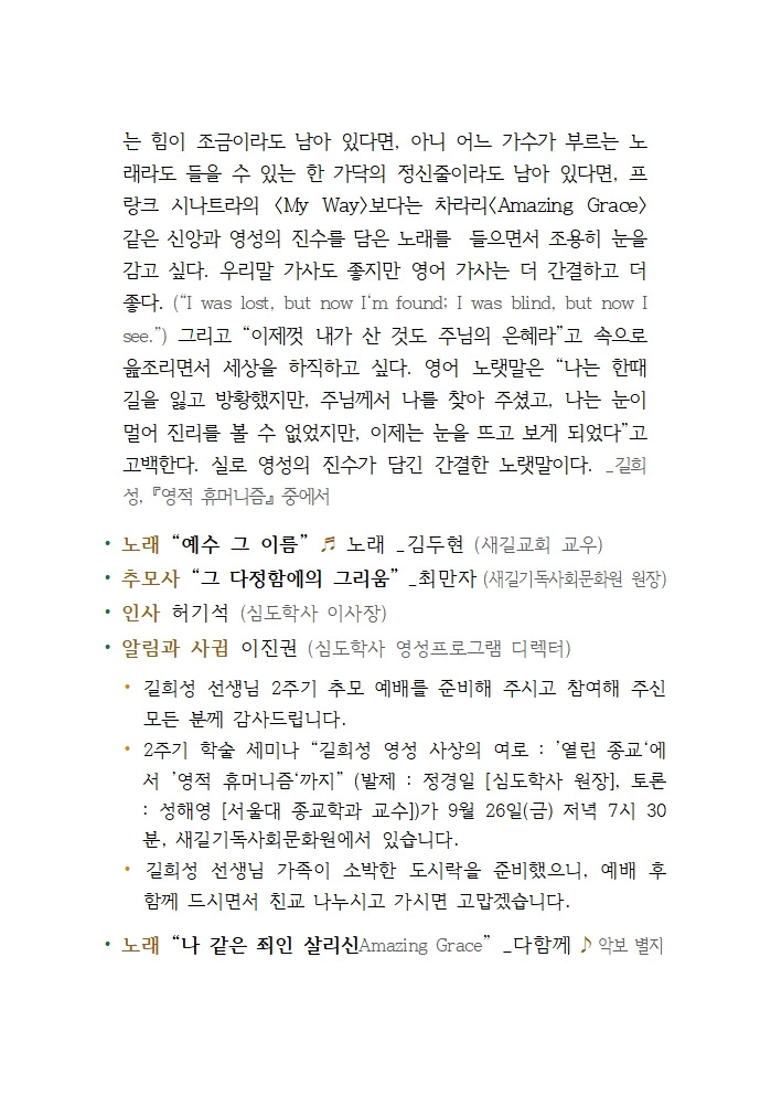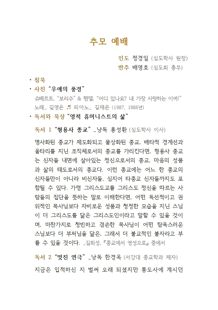 길희성 선생님 2주기 추모예배 풍경 작성자Simdohaksa|작성시간25.09.09|조회수151 목록 댓글 0 글자크기 작게가 글자크기 크게가 사진_ 이원영 님 (새길교회) 다음검색 현재 게시글 추가 기능 열기 북마크 공유하기 신고 센터로 신고 댓글 댓글 0 댓글쓰기 답글쓰기 댓글 리스트