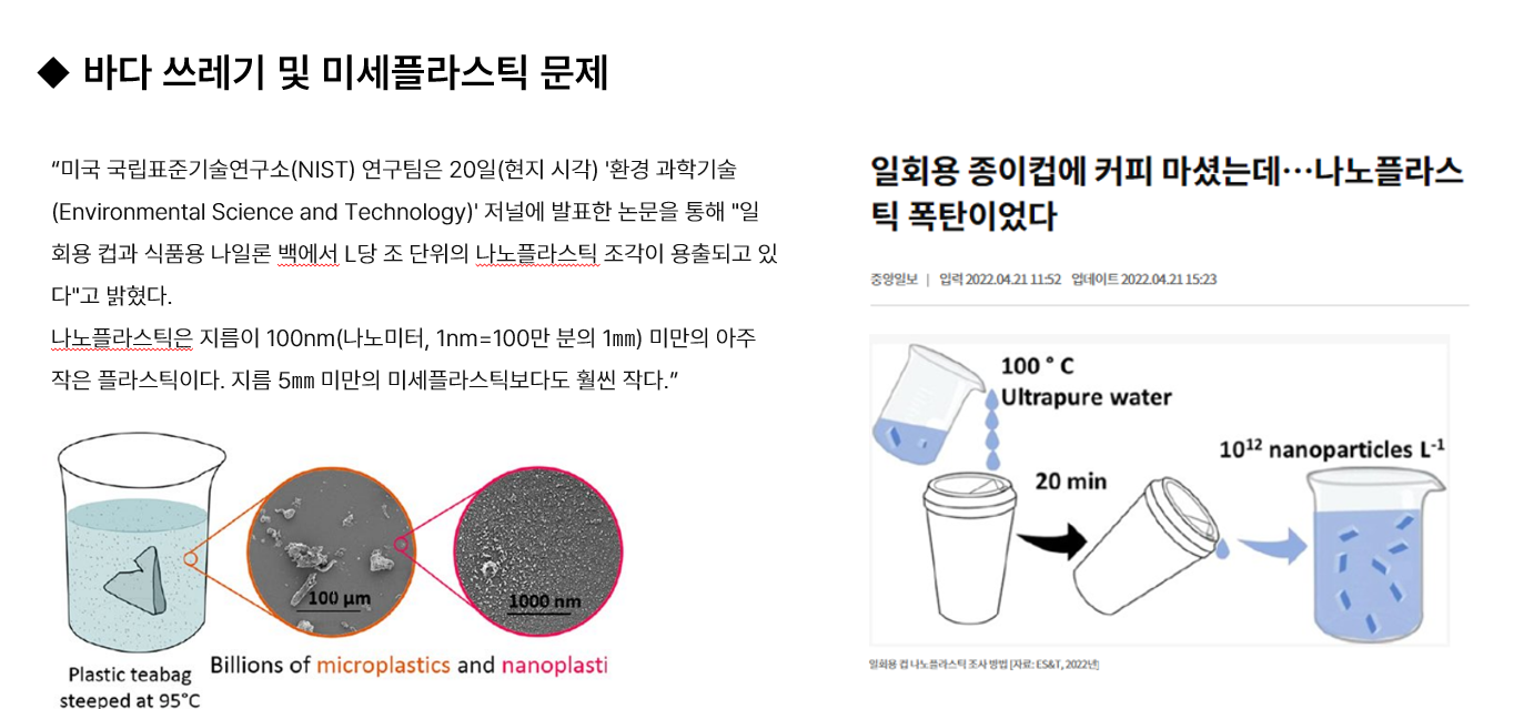 플라스틱 쓰레기는 크기에 따라 여러 종류로 나누는데 나노 플라스틱(초미세 플라스틱, 1nm~100nm)은 모든 장기에 접근할 수 있고, 혈액뇌장벽 및 태반 장벽으로 이동할 수 있다. (자료 : 유엔 해양환경전문가그룹, 한국생명공학연구원) 바다로 버려진 플라스틱 쓰레기는 해양 생물들에게 피해를 주고 있다.