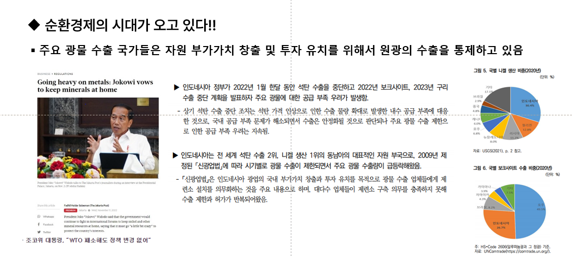"자원위기, 산업경쟁력 강화, 에너지 전환 대비를 위한 국제 자원공급망이 변화하고 있다. 자원공급망 폐쇄성이 강화되고 있고, 주요 광물 수출국들은 부가가치 창출 및 투자 유치를 위해서 광물의 수출을 통제하고 있다. 자원공급망 변화에 대응하기 위해서는 천연자원의 투입을 최소화할 수 있는 자원공급망으로 재편이 필요하다.