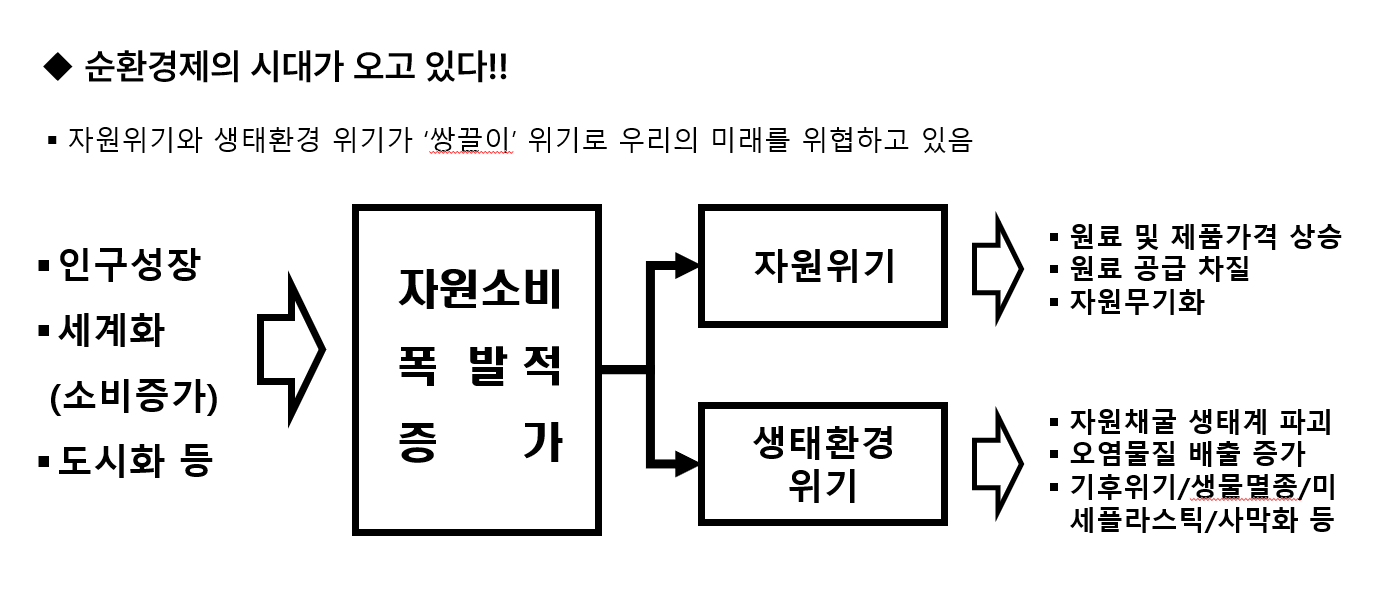 "2000년 이후부터 자원 소비가 폭증하고 있다. 자원고갈위기, 생태위기, 경제위기 등 복합 다중위기 상황이다. 자원위기는 원료 및 제품가격 상승, 원료공급 차질, 자원 무기화로 나타나고 있고, 생태위기는 자원채굴로 인한 생태계 파괴, 오염물질 배출 증가, 기후위기, 생물 멸종, 미세플라스틱, 사막화 등으로 나타나고 있다.