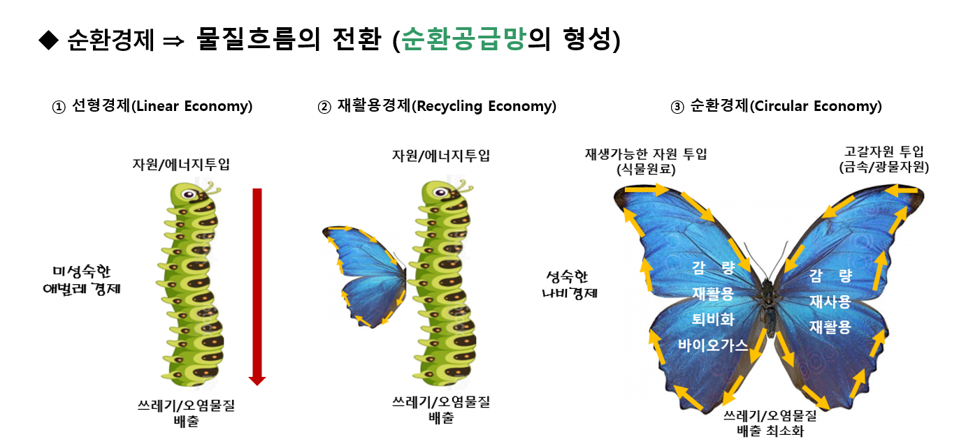 순환경제는 물질 흐름의 전환이다. 순환공급망의 형성이다. 자원을 투입하여 생산하고 소비하고 폐기물로 버리는 선형경제(미성숙한 애벌레 경제)에서 고갈자원 사용을 줄이고, 재생 가능한 자원을 투입하여 쓰레기와 오염물질을 최소화는 순환경제(성숙한 나비 경제)로 가야 한다."