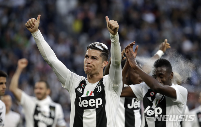 ▷ 본, 'Netizen Photo News' 는 가입 필요없이 손님께서도 연결에 넣어두고 날마다 보실 수 있습니다. (저작권 있음) '한국 네티즌본부' ○··· 【토리노(이탈리아)=AP/뉴시스】유벤투스의 크리스티아누 호날두가 20일(현지시간) 이탈리아 토리노의 알리안츠 스타디움에서 열린 2018-19시즌 이탈리아 세리에A 33라운드 피오렌티나와의 경기에서 2-1 승리, 우승을 확정한 후 환호하고 있다. 호날두는 맨유에서 3번, 레알 마드리드 2번, 유벤투스로 이적하자마자 우승을 차지해 6번째 리그 우승컵을 들어 올려 스페인 프리메라리가, 잉글랜드 프리미어리그, 이탈리아 세리에A 등 유럽 3대 리그를 모두 정복하는 대기록을 달성했다. ☞ 원본글: 뉴시스| Click ○←닷컴가기. |