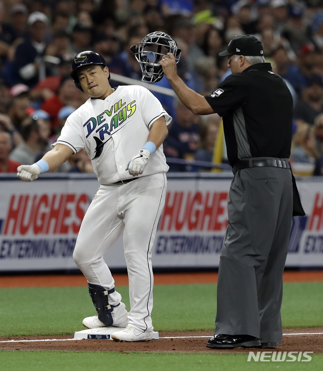 ▷ 본, 'Netizen Photo News' 는 가입 필요없이 손님께서도 연결에 넣어두고 날마다 보실 수 있습니다. (저작권 있음) '한국 네티즌본부' ○··· 【세인트피터즈버그=AP/뉴시스】 탬파베이 레이스의 최지만(사진 왼쪽)이 21일(한국시간) 미국 플로리다주 세인트피터즈버그의 트로피카나 필드에서 열린 2019 메이저리그(MLB) 보스턴 레드삭스와의 경기에서 3번 타자 겸 1루수로 선발 출전, 4회말 3루타를 때려낸 후 기뻐하고 있다. ☞ 원본글: 뉴시스| Click ○←닷컴가기. |
