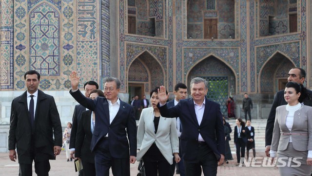 ▷ 본, 'Netizen Photo News' 는 가입 필요없이 손님께서도 연결에 넣어두고 날마다 보실 수 있습니다. (저작권 있음) '한국 네티즌본부' ○··· 【사마르칸트(우즈베키스탄)=뉴시스】박진희 기자 = 우즈베키스탄을 국빈방문 중인 문재인 대통령이 샤프카트 미르지요예프 대통령과 20일 오후 (현지시각) 사마르칸트 레기스탄 광장에서 박수치는 시민들에게 손을 흔들고 있다. ☞ 원본글: 뉴시스| Click ○←닷컴가기. |