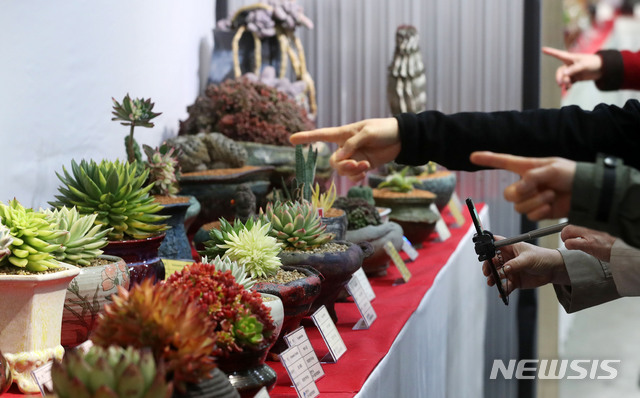 ▷ 본, 'Netizen Photo News' 는 가입 필요없이 손님께서도 연결에 넣어두고 날마다 보실 수 있습니다. (저작권 있음) '한국 네티즌본부' ○··· 21일 오전 서울 서초구 양재동 aT화훼공판장에서 열린 '2019 대한민국 다육식물 대전'에서 시민들이 전시된 식물들을 둘러보고 있다. 작년에 이어 2회째를 맞은 이번 다육식물 대전은 돌나물과 다육식물, 선인장, 수공예화분 등 550여종의 다양하고 희귀한 다육식물들이 전시된다. 홍효식 기자 ☞ 원본글: 뉴시스| Click ○←닷컴가기. |
