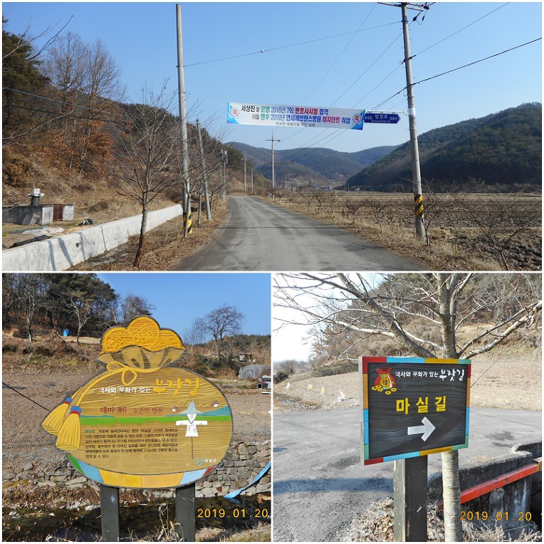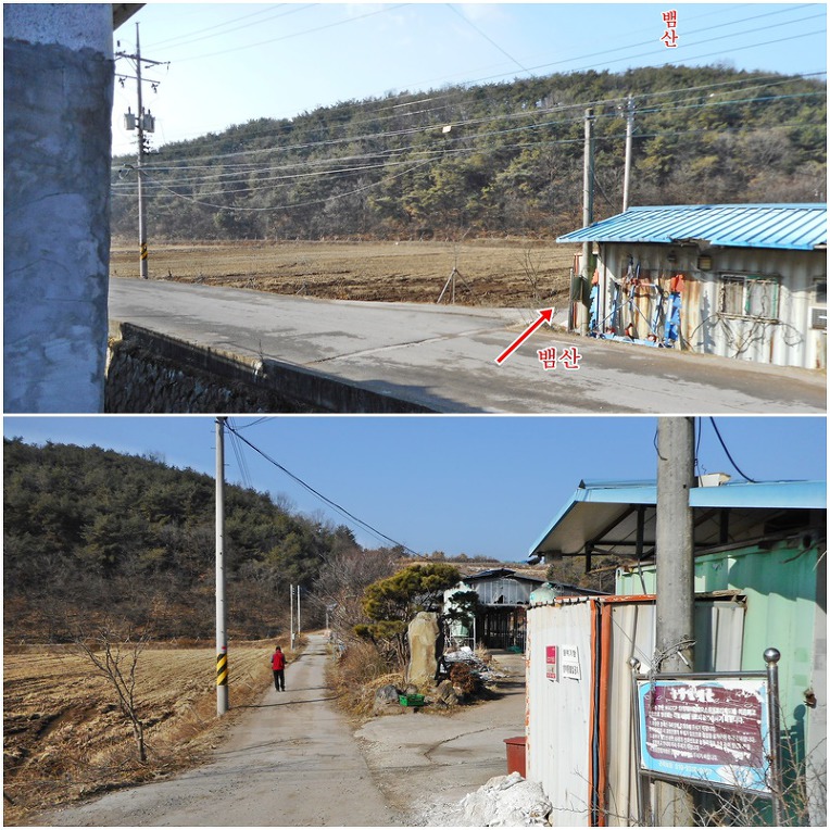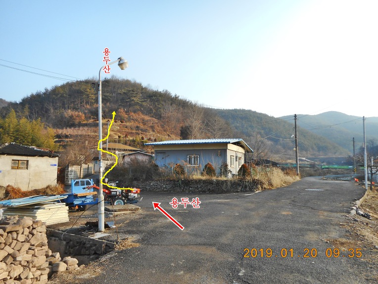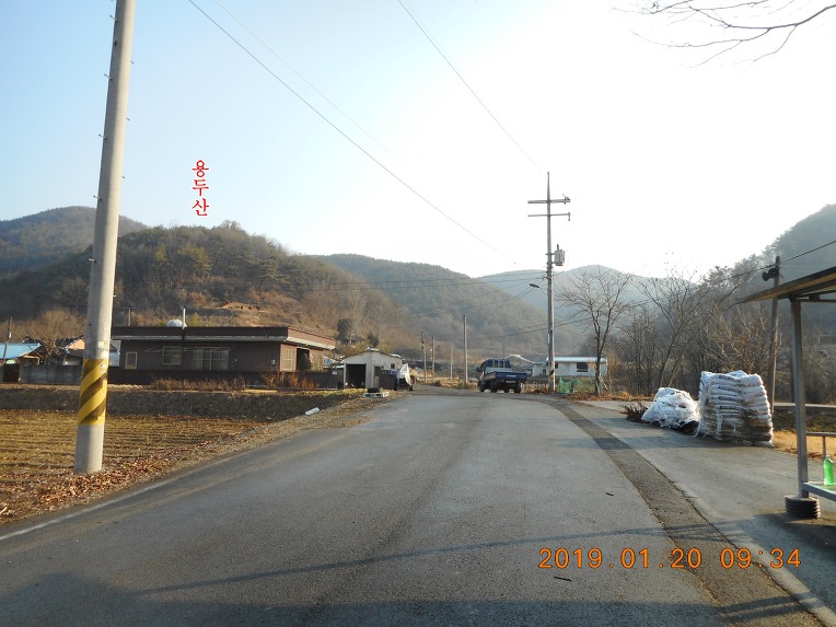 얼마 진행하지 않아 나오는 마을끝 지점의 갈림길에서 용두산 능선 끝자락 방향인 좌측길로 꺽어듭니다.