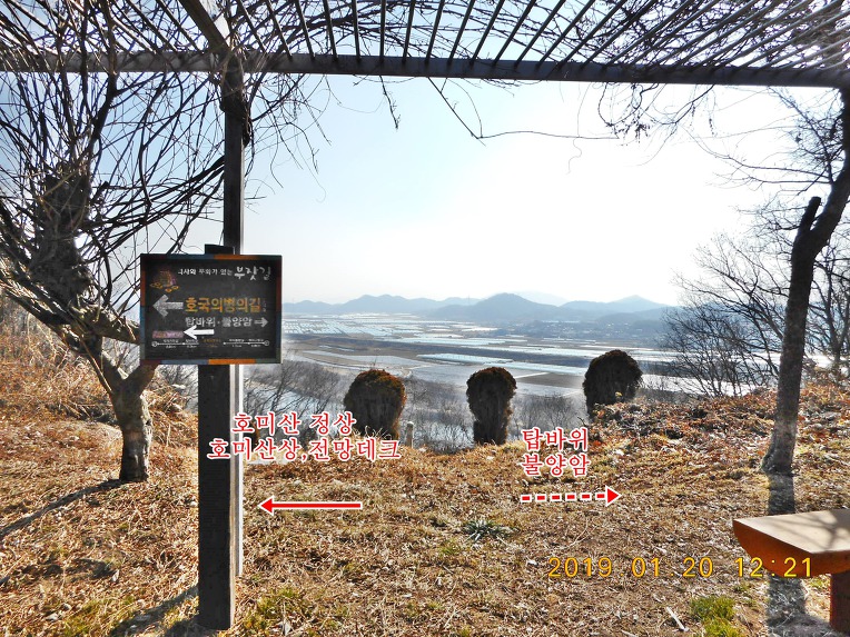 쉼터로 조성이 된 능선 삼거리에 올라서고, 좌측 호미산성이 있는 호미산 정상부터 답사하고 난뒤 ,우측 불양암과