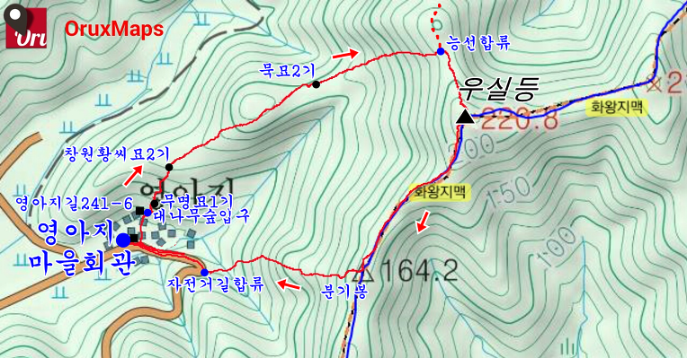 오룩스앱을 가동하고는 마을안길을 따라 들어가며 산행에 들어갑니다.마을 뒤로 첫번째 답사하게 될 영진
