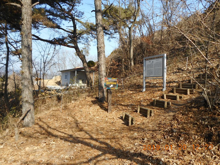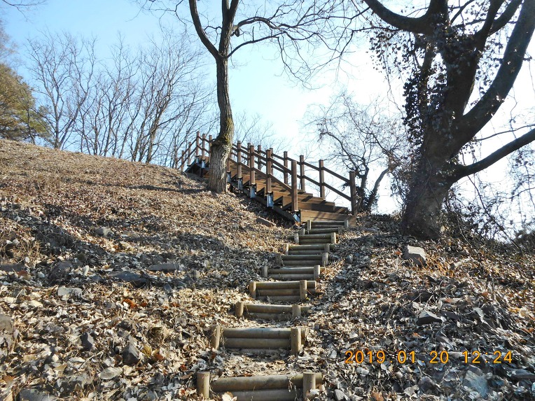 좌측으로 몇발짝 이동하니 받침목 계단길로 이어지며,호미산성 안내판이 세워져 있는게 보이네요.