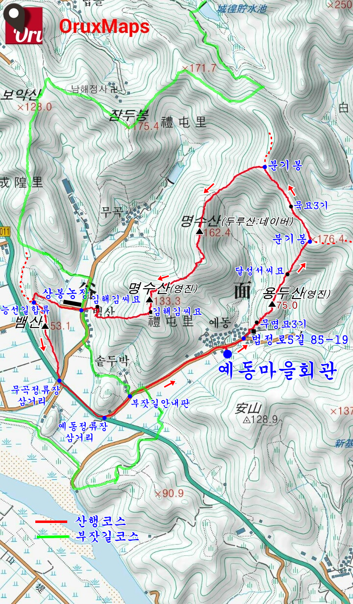 ㅇ.산행코스: 예동마을회관-명수산(두루산:네이버지도)정상-명수산(영진지도)정상-뱀산마을-뱀산 정상