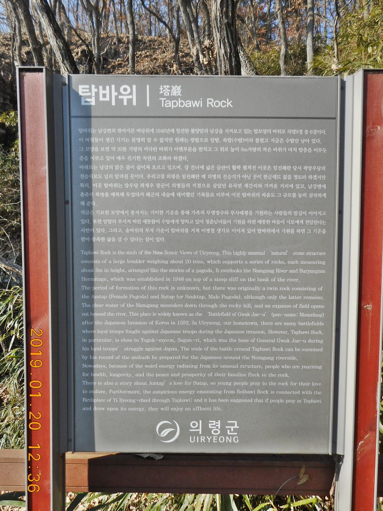 의령 땅에는 의병의 전승지가 도처에 있지만 특히 이곳 탑바위는 곽재우가 의병군의 거점으로 삼았던 유곡면