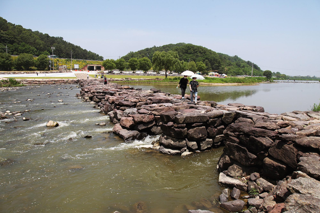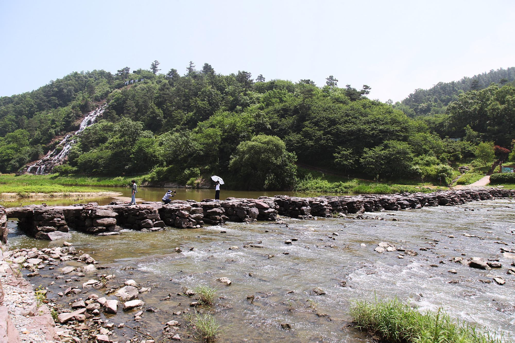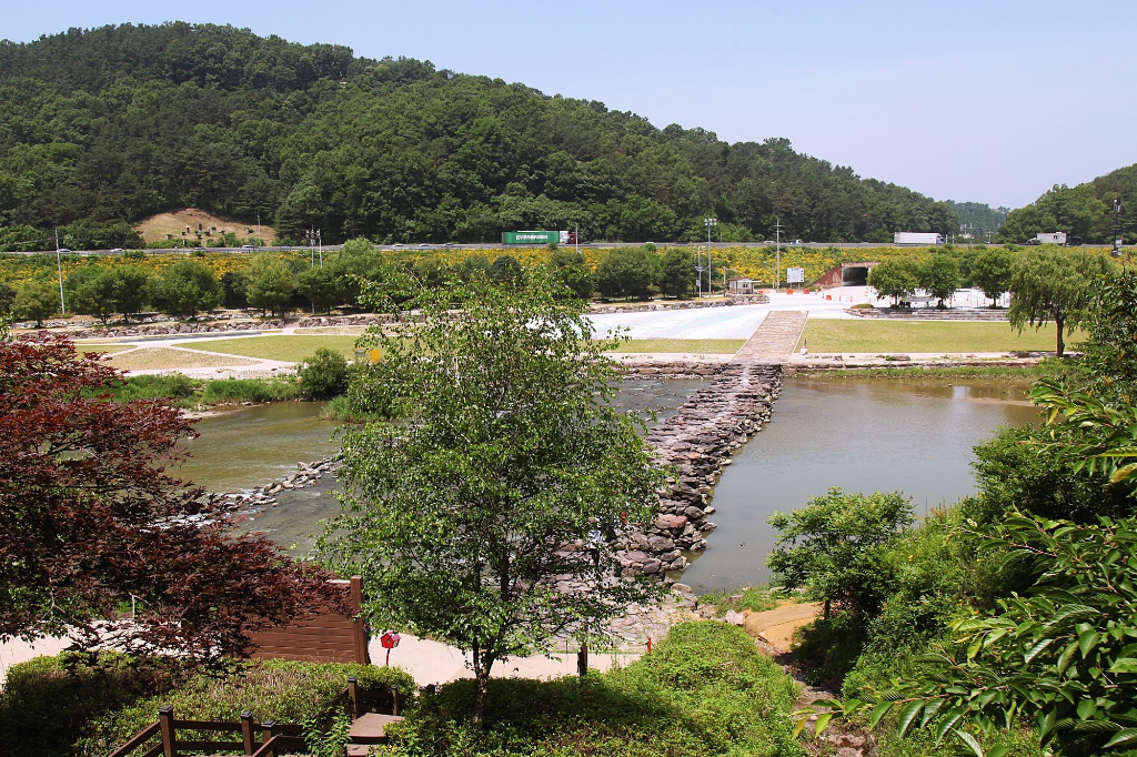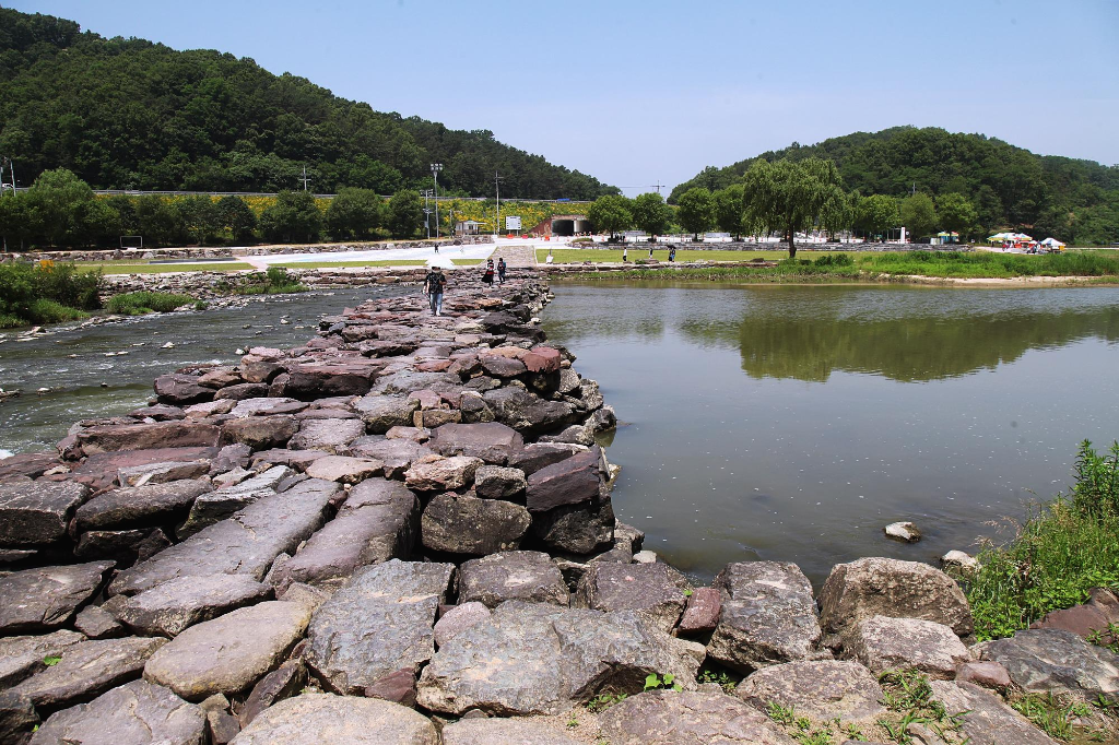 지만 농다리도 지나는 길에 잠시 둘러보는 여정이라서 발길을 돌려 천변 언덕에 조성한 인공폭포를 거쳐 징검다리