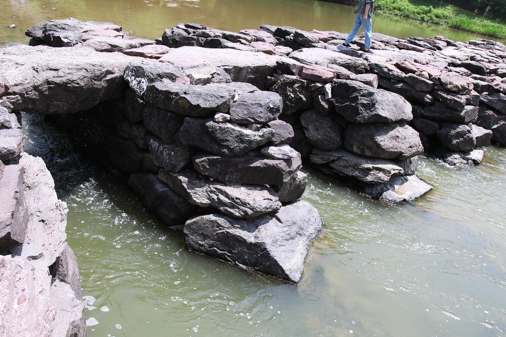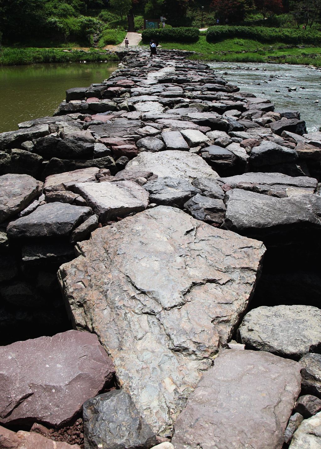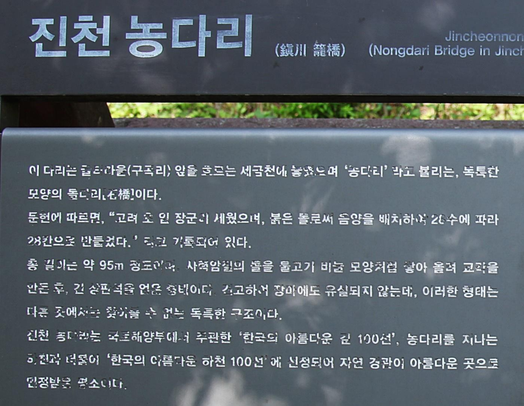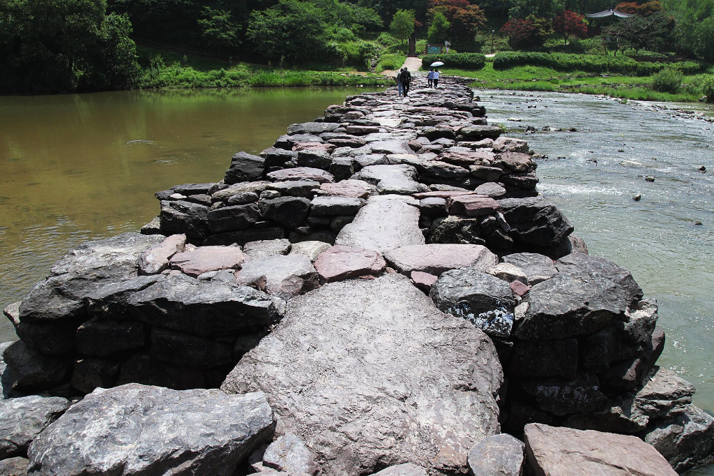 폭 1.2m 거리마다 쌓고 또 쌓아 그 위에 한 장, 또는 두 장의 자연석 판석을 걸쳐 놓으며 93,6m를 이었다. 다리를 건