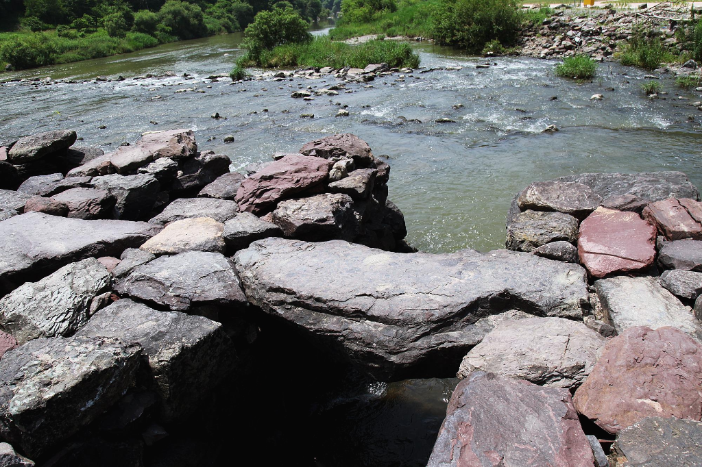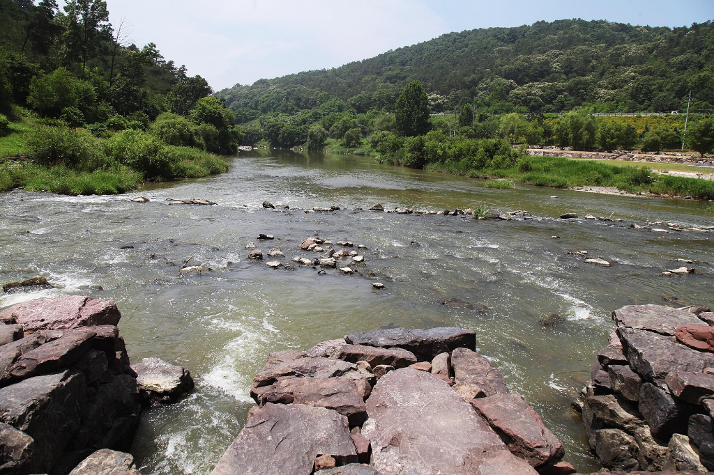 ▼농다리에서 본 다리 상류 미호천