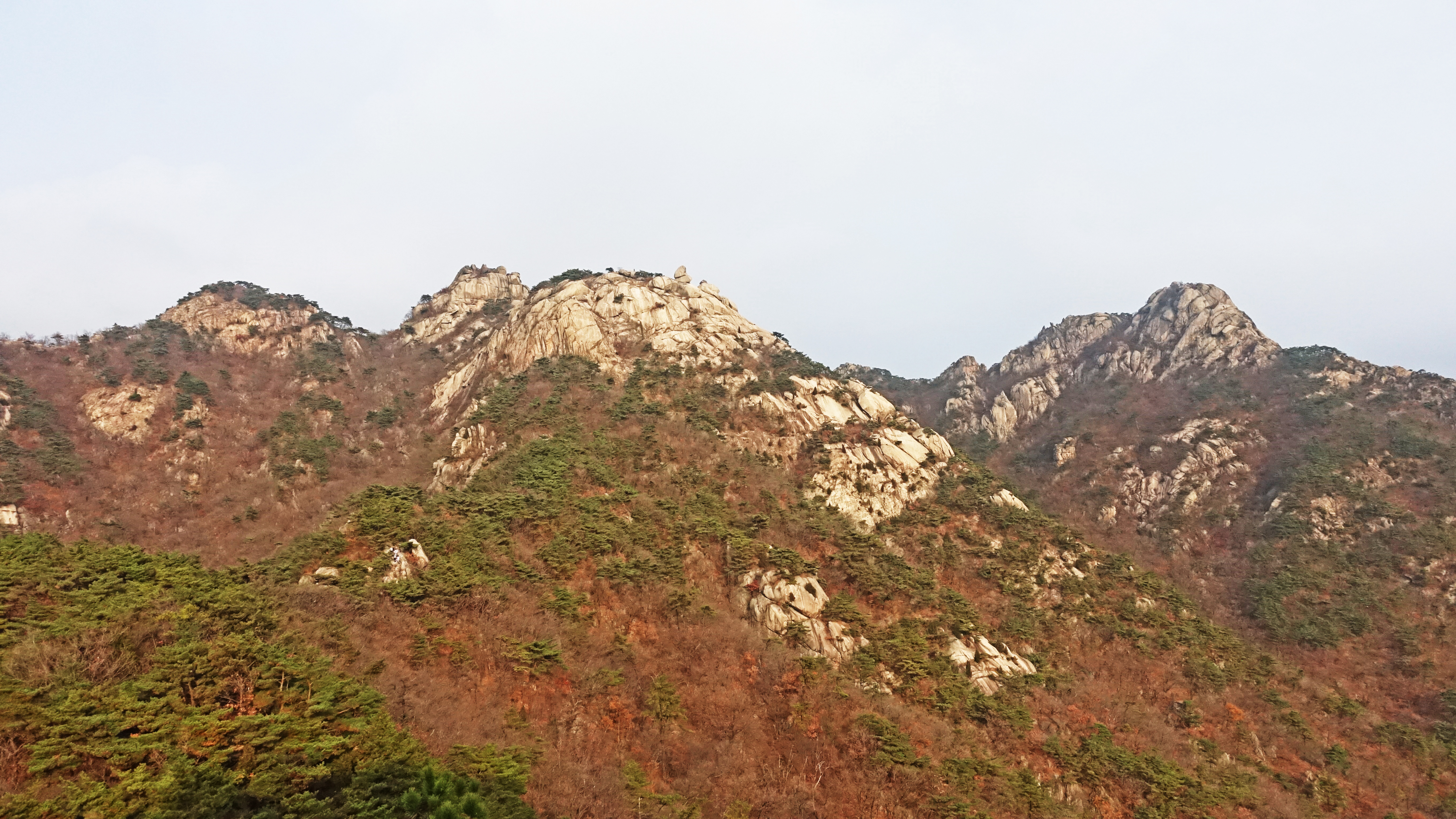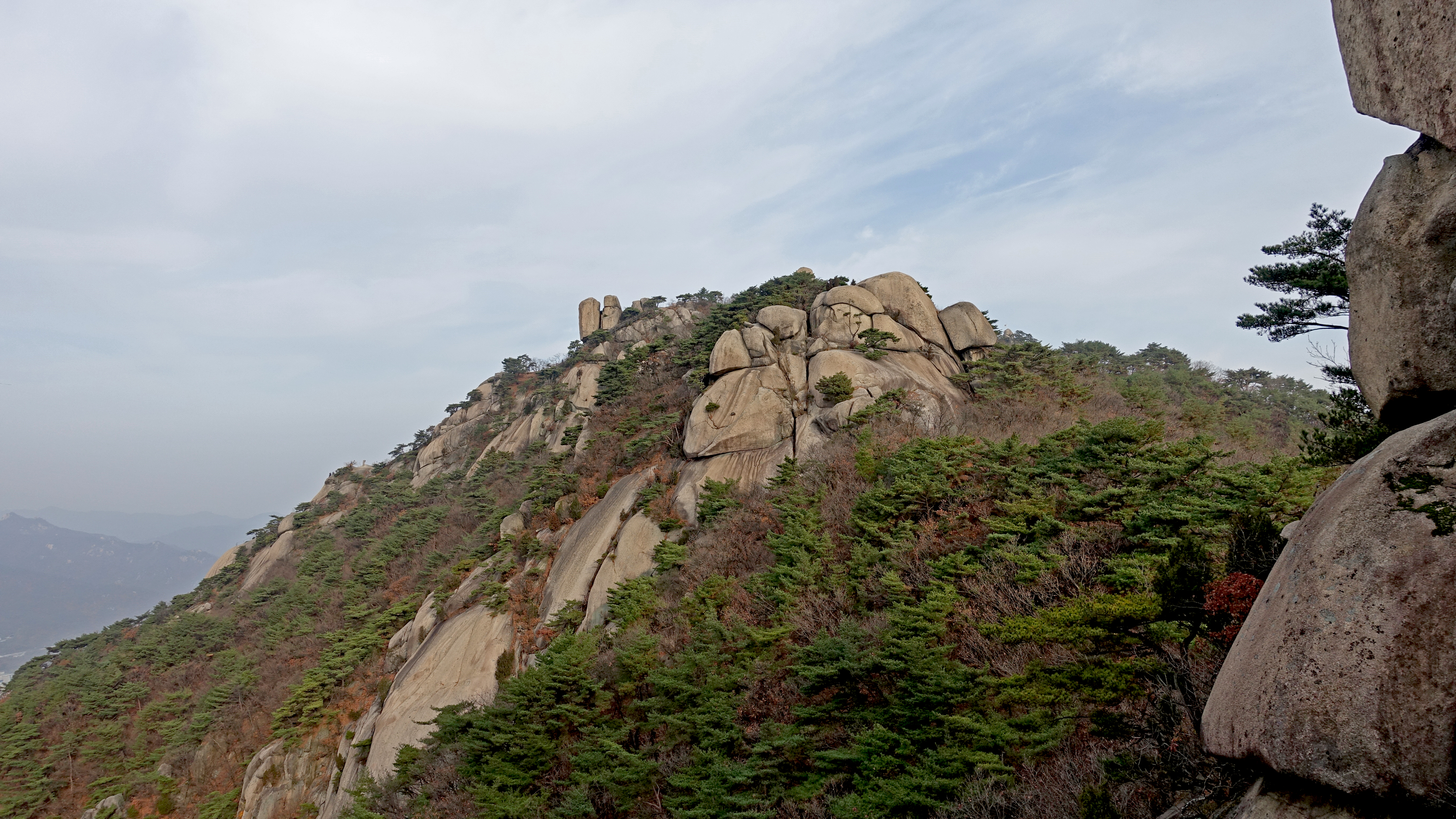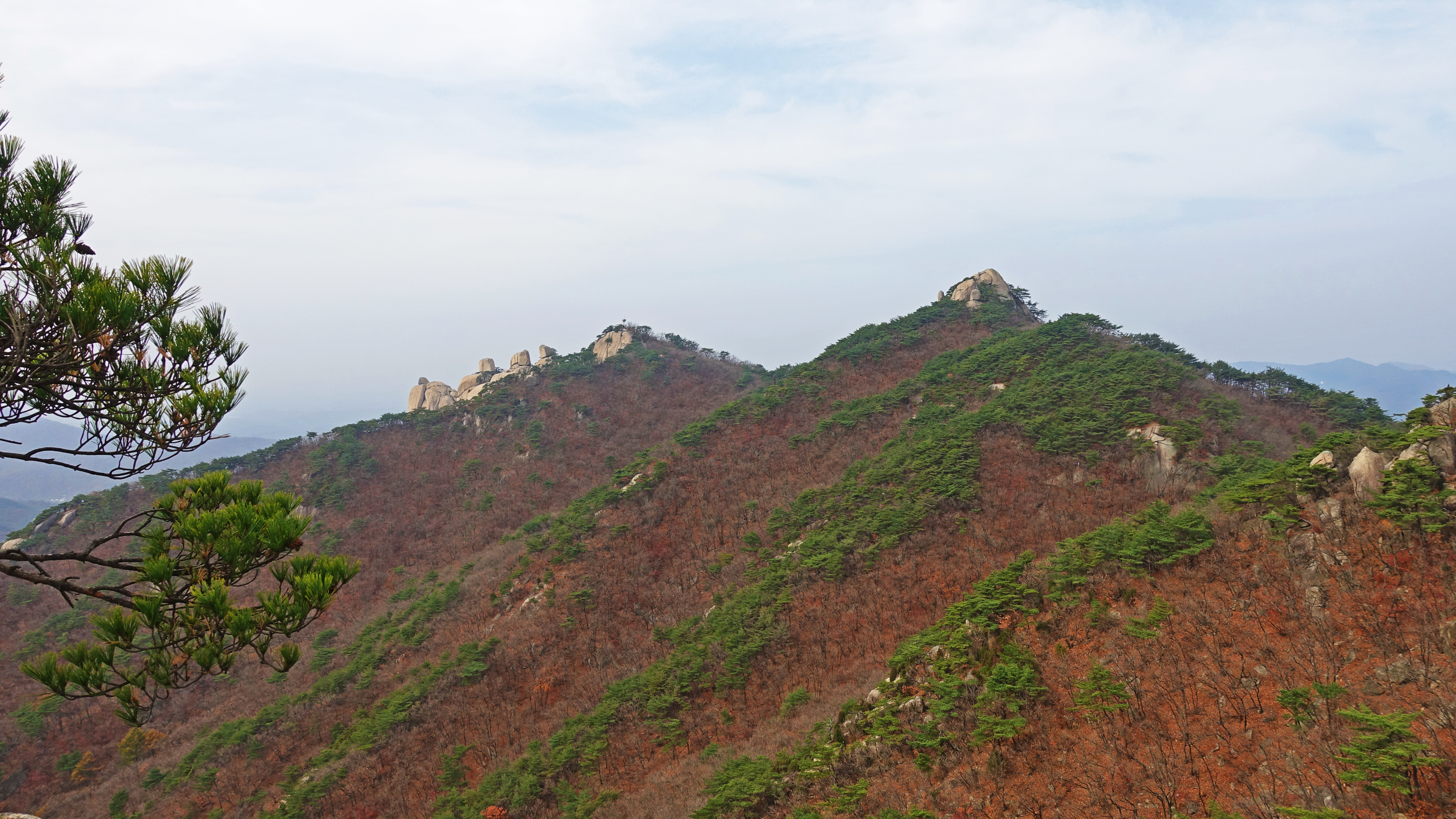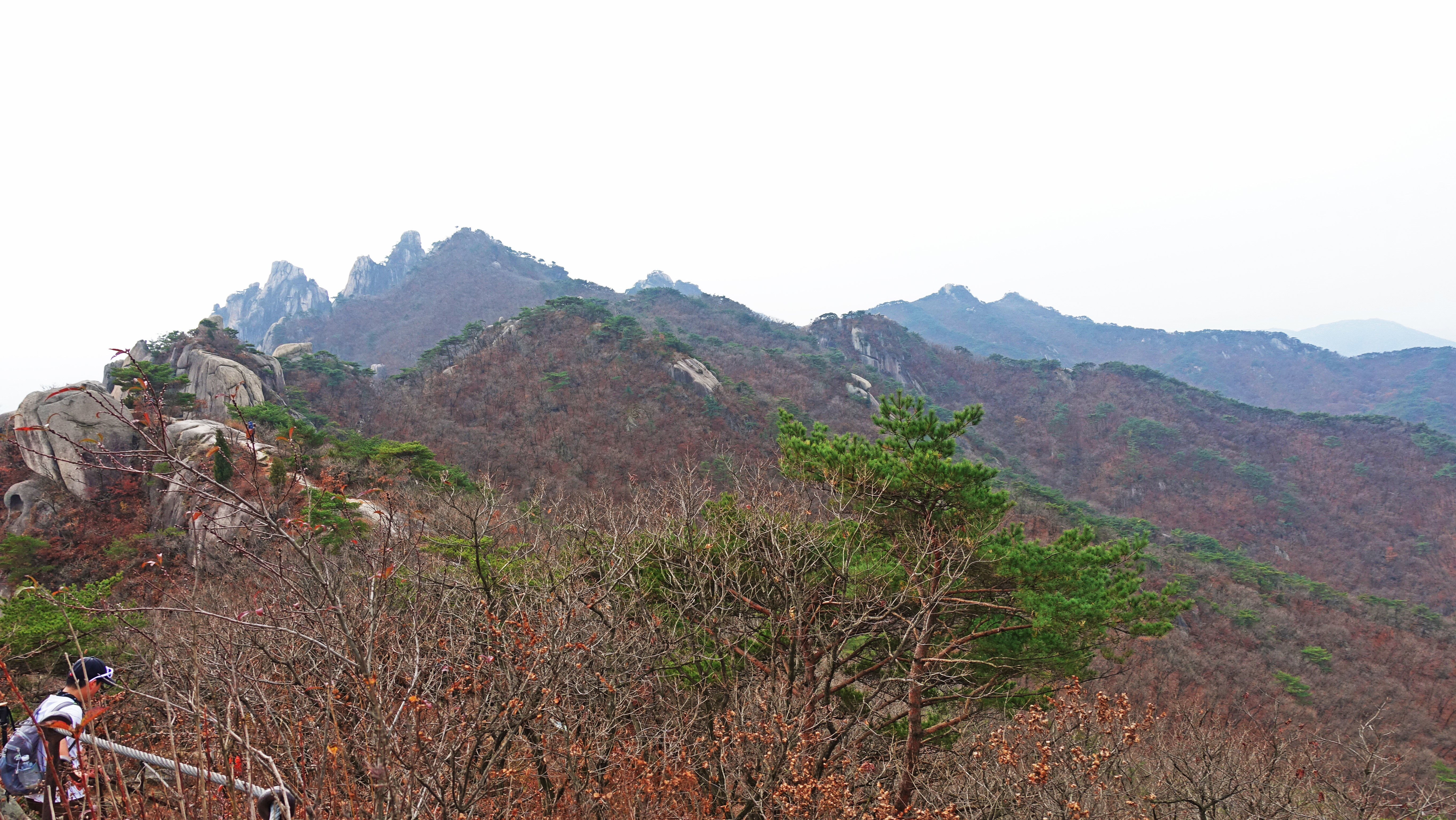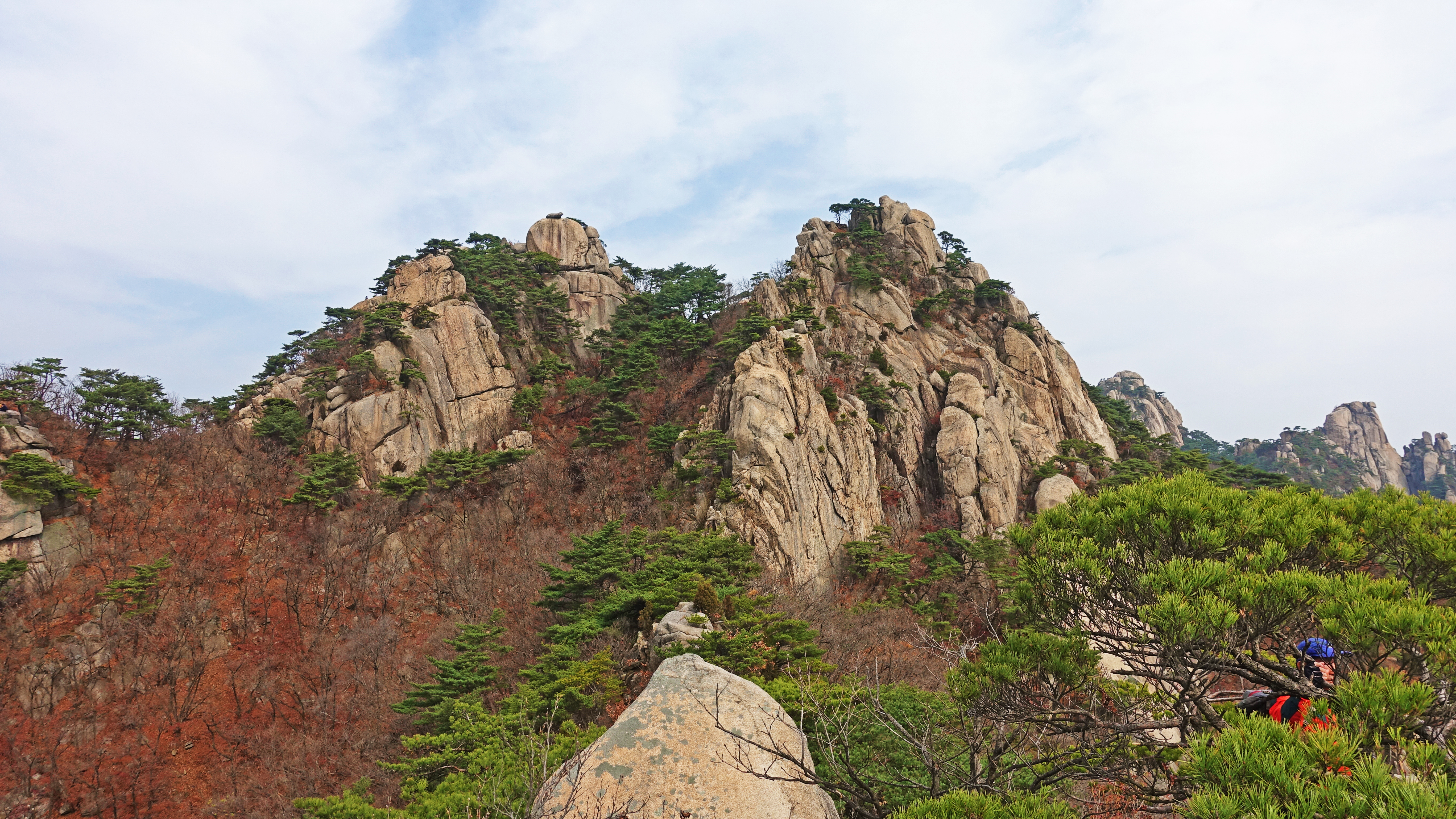 뒤쪽으로 웅장한 암봉이 능선을 만들고 있다.