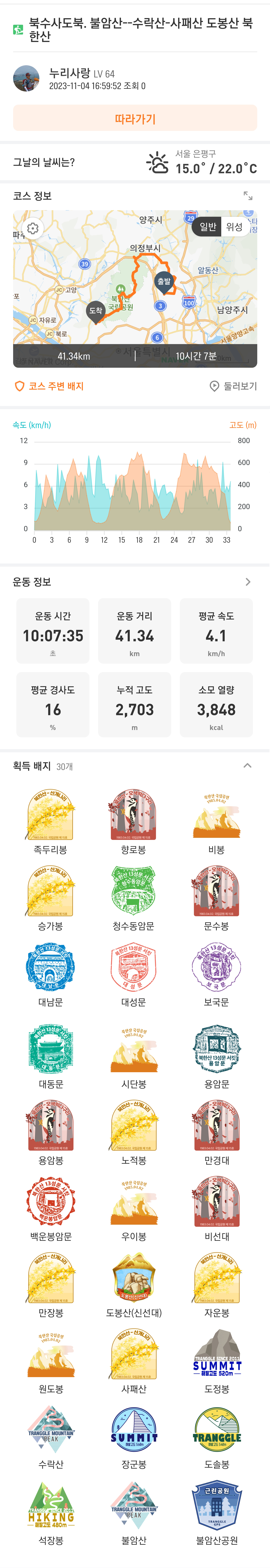 - 전체적으로 초 중반까지는 속도가 나는데 도봉산을 넘어서 오봉 능선까지 평균 속도가 많이 떨어지고 또 우이동 탐방지원센터에서 백운봉암문까지 속도가 떨어지는데 노적봉 지나서 평균 시간을 조금 올릴 수 있다.