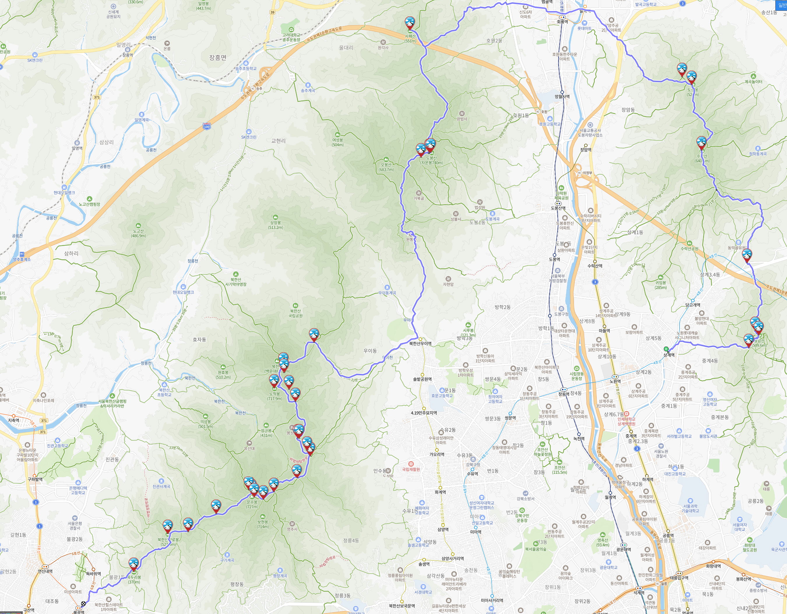 * 코스 : 상계역 1번 출구 -재헌중학교-정암사-깔딱 고개(1.9KM/28m)-거북바위-불암산(0.3km/9m)-석장봉(0.1km/6m)-덕릉고개(1.7km/18m)-치마바위-코끼리바위-철모바위-도솔봉-수락산(3.78km/51m) -도정봉(1.8km/25m)-동막봉(0.2km/10m)-동암중학교-회룡역-범골매표소-호암사-해골바위-회롱바위갈림길-사패산(7.7km/1 h37 m)-도봉산(자운봉. 신선봉)(3.3 km58 m)-주봉(0.2km/13m) -오봉갈림길-우이암-원통사-우이암매표소-버스종점-삼양로173길-지장암-하루재(7.9km/2 h7 m)-백운봉(봉암문)(1km/27m)~만경대(0.1km/8m)-노적봉(0.3km/10m)-용암봉(0.2km/2m)-용암문(0.3km/3m)-시단봉(동장대)(0.9km/10m)-덕장봉(0.4km/3m)-대동문(0.1km/1m)-보국문(0.6km/6m)-대성문(0.7km/12m)-대남문(0.2km/6m)-문수봉(0.2km/4m)-청수동암문(상원봉 남장대)(0.2km/2m)-승가봉(0.9km/15m)-사모바위-비봉(0.7km/11m)-향로봉(0.4km/6m)-족두리봉(1.3km/20m)-불광동 대호아파트~불광역