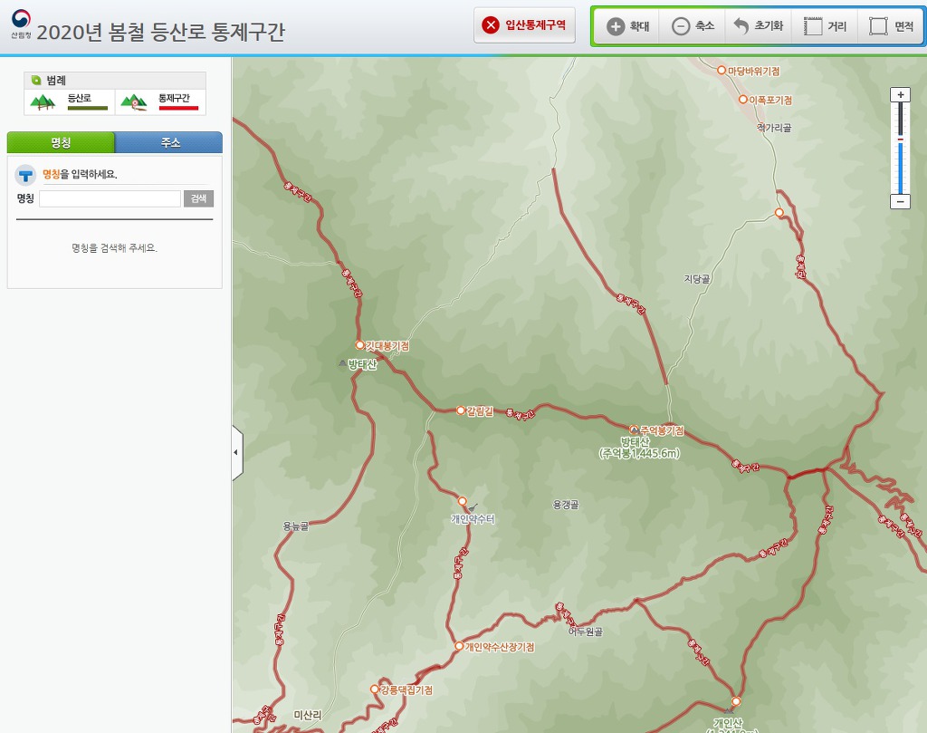 아래 링크를 클릭하면 산림청에서 공지하는 등산로 통제를 지도로 확인할 수 있음.