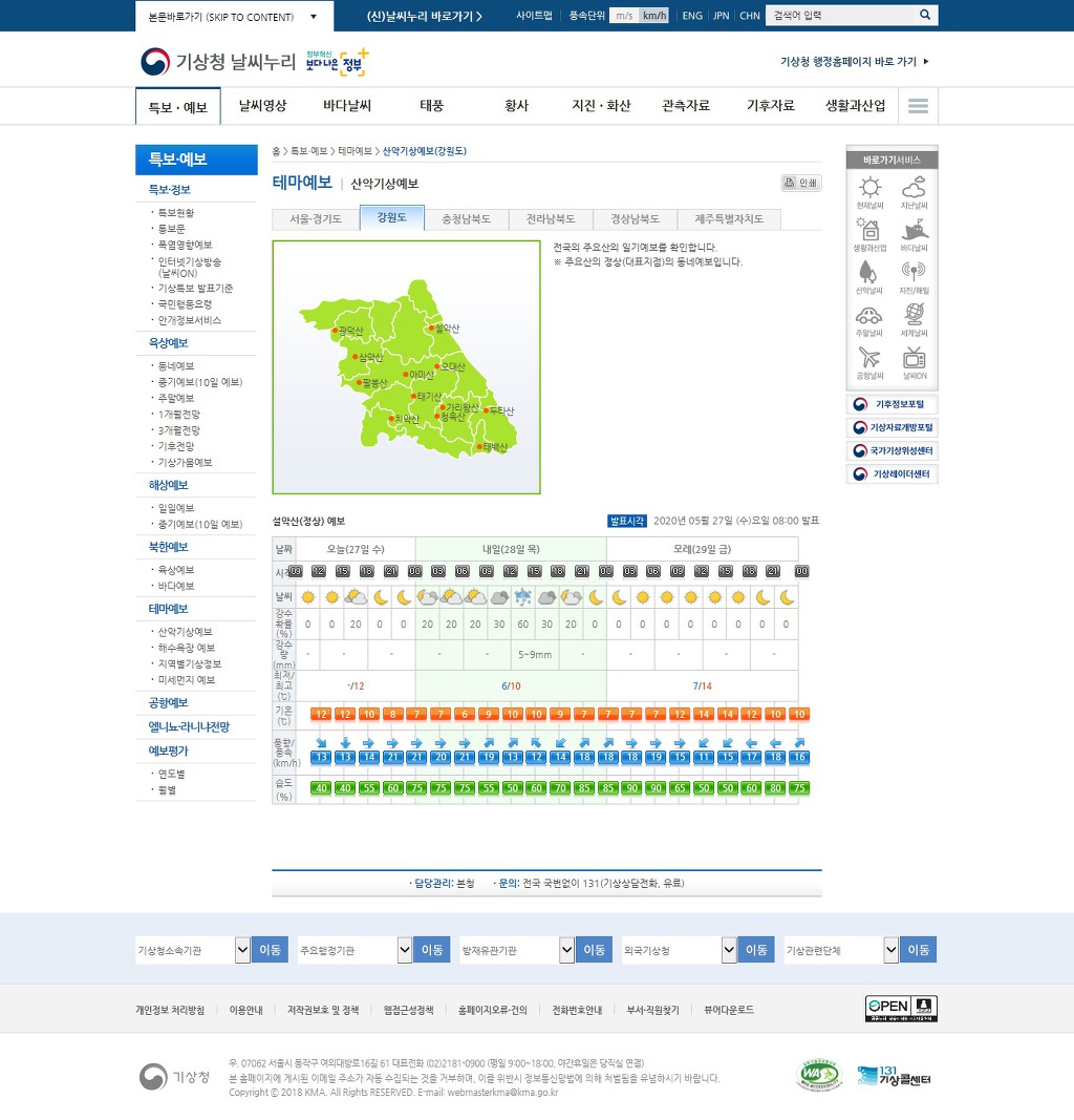 2) 산악 기상예보를 보고 습도와 운도차를 보면된다.