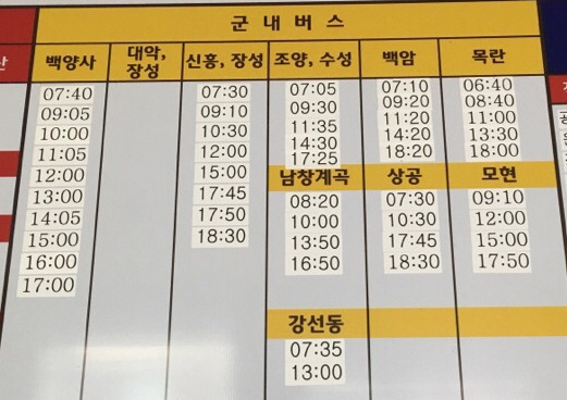백암 : 07:10 , 09:20 , 11:20 , 2:20 , 6:20