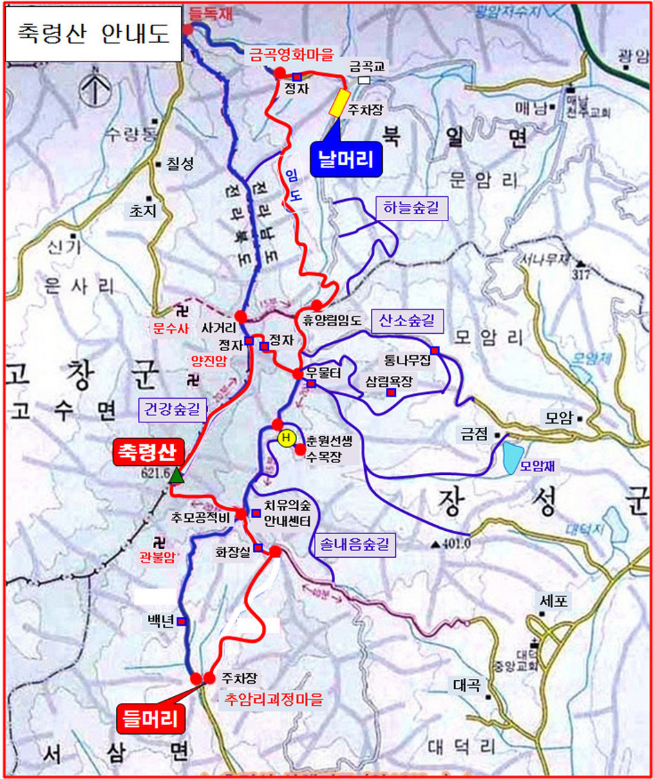 축령산 산행의 깃점은 광주에서 갈 경우 서삼면 추암리 괴정마을, 서삼면 대덕리 대곡마을, 혹은 북일면 금곡마을 등 세방면으로 접근한다.