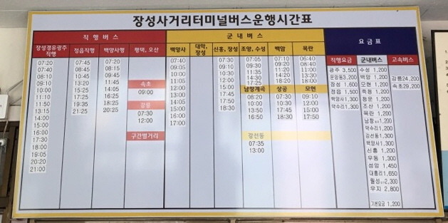 장성 사거리 터미날 버스 시간표 (2016년 11월)