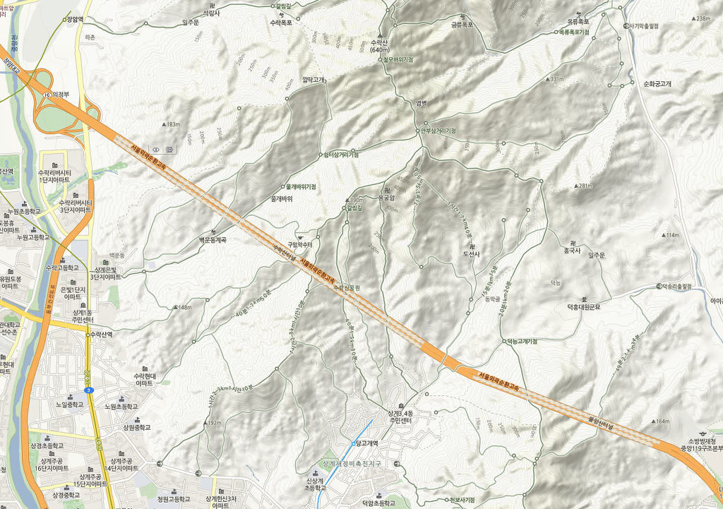 당고개역을 산행기점은 여러갈래가 있다. 540봉에 올라 주능선을 타고 정상에 이른다. 이 코스는 하산코스로 주로 이용한다.