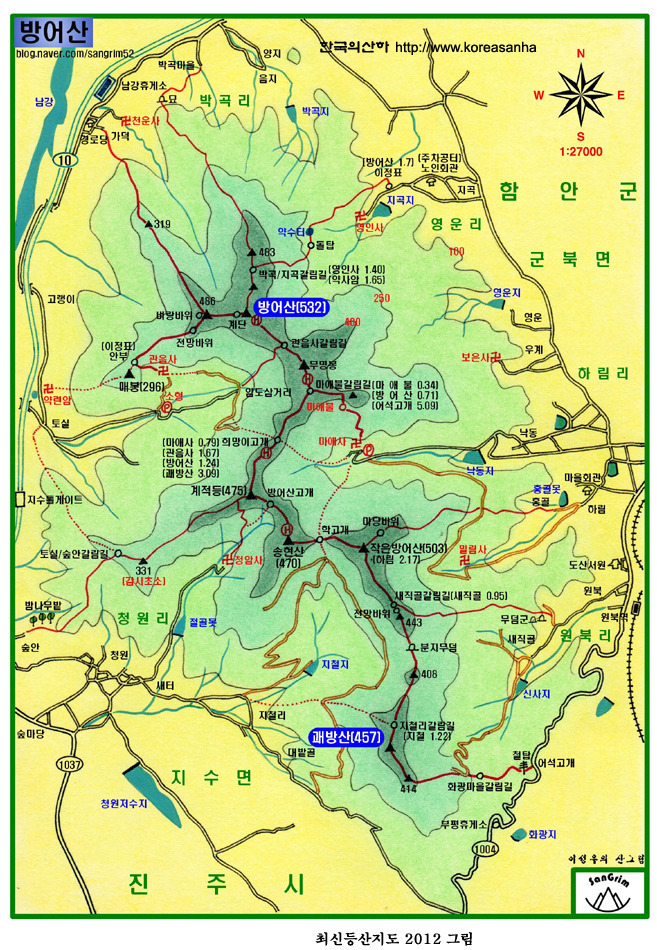 방어산은 함안군 군북면과 진주시 지수면을 경계 짓는 산으로 웅산이라고 불려지기도 했다.