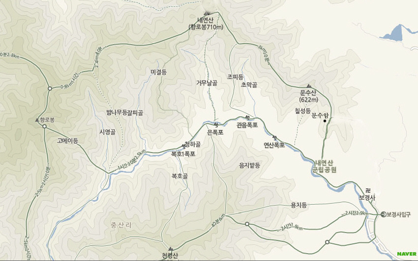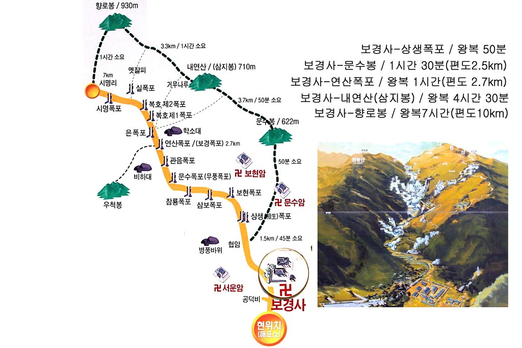 보경사-(50분)- 문수암 -(50분)- 문수봉- (1시간)- 정상(삼지봉) -(1시간 10분)-미결등 코스(은폭)-(20분)-은폭 -(1시간)- 보경사