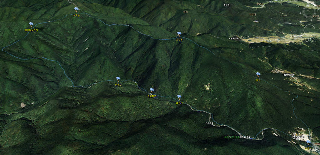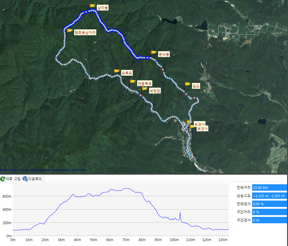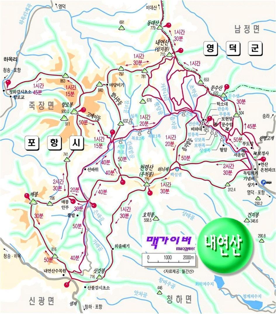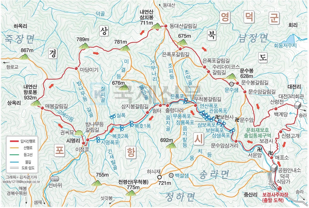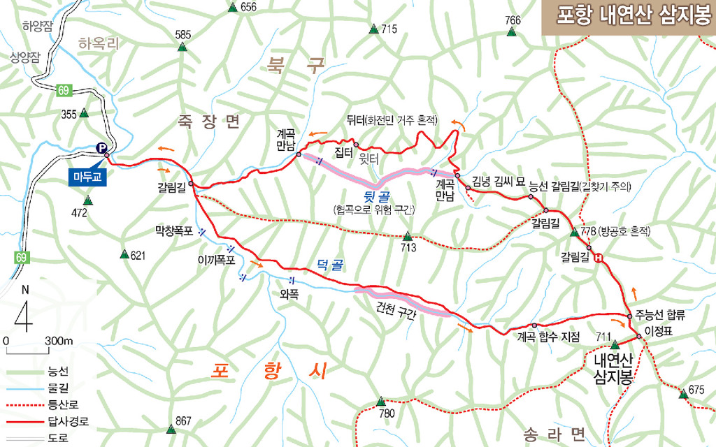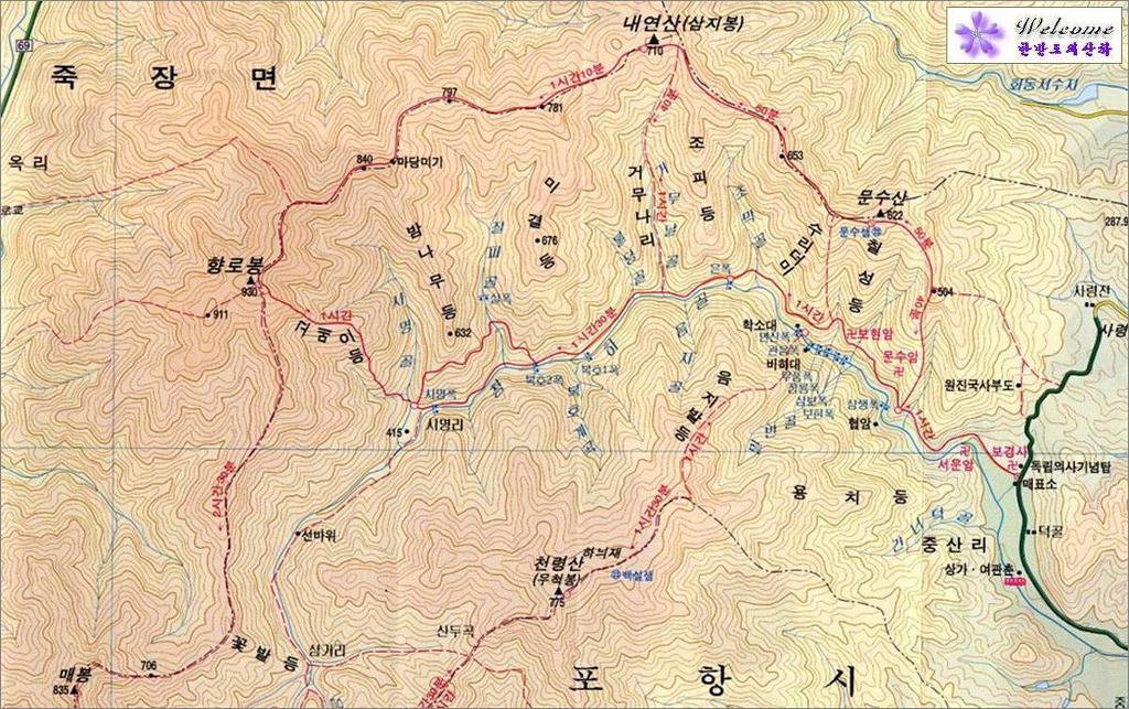 보경사-(50분)- 문수암 -(50분)- 문수봉- (50분)- 정상(삼지봉) -(1시간 10분)-거무나리 코스(은폭) -(1시간)-보경사 정상에서 600m되내려와 거무나리 코스 이용
