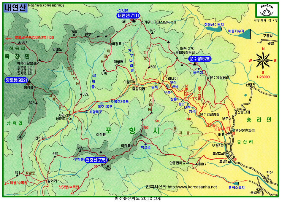 단풍이 들면 보는 사람으로 하여금 가슴을 울렁이게 한다는 내연산, 10월 하순에 절정을 이루고, 활엽수가 많아 11월 초순에는 낙엽산행으로 적기이다.