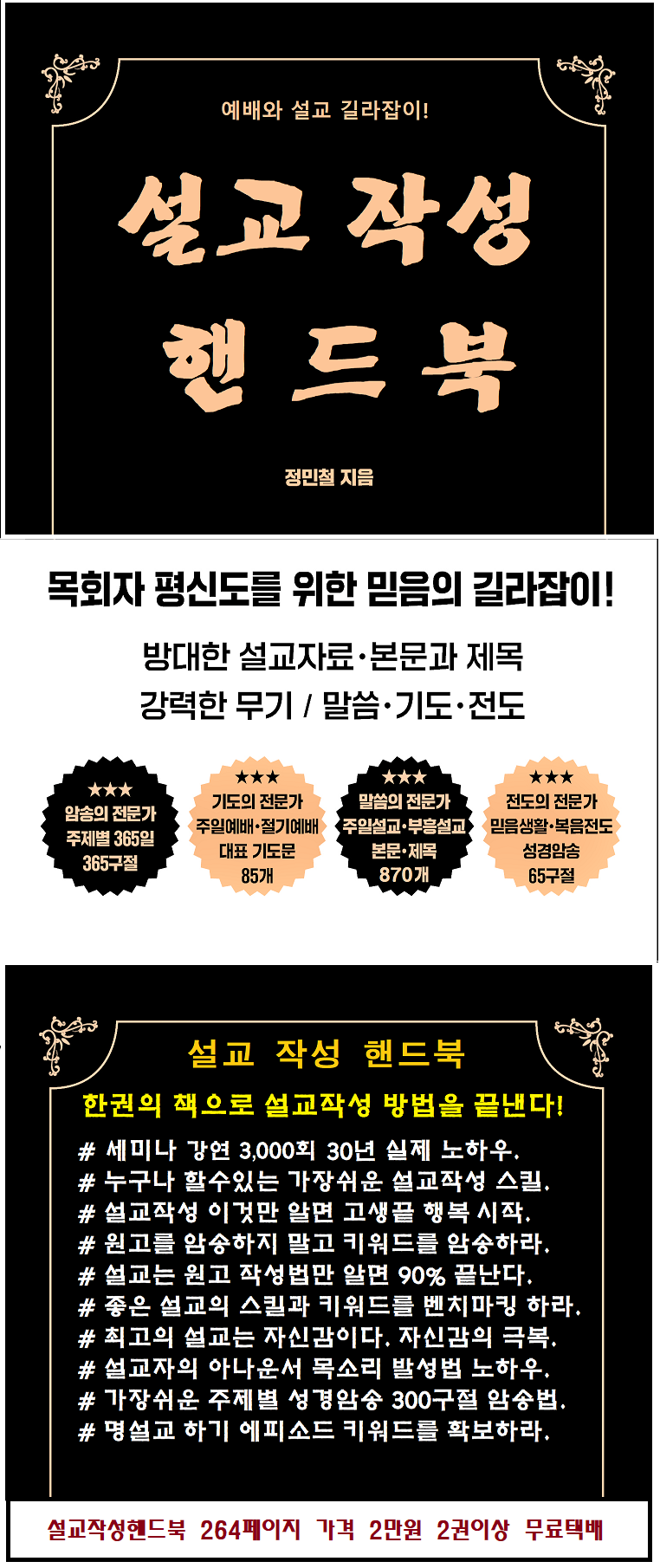 설교는 어렵지 않습니다. 보통 교회에서 주일설교 한편을 설교하기 위해서 수많은 시간과 수많은 서적 수많은 다른분들의 설교를 듣고 보고해서 설교가 만들어 집니다. 아래 설교를 잘 편집해서 성경구절을 많이 넣어서 3분.5분.10분,20분,30분 알아서 올리시면 됩니다.